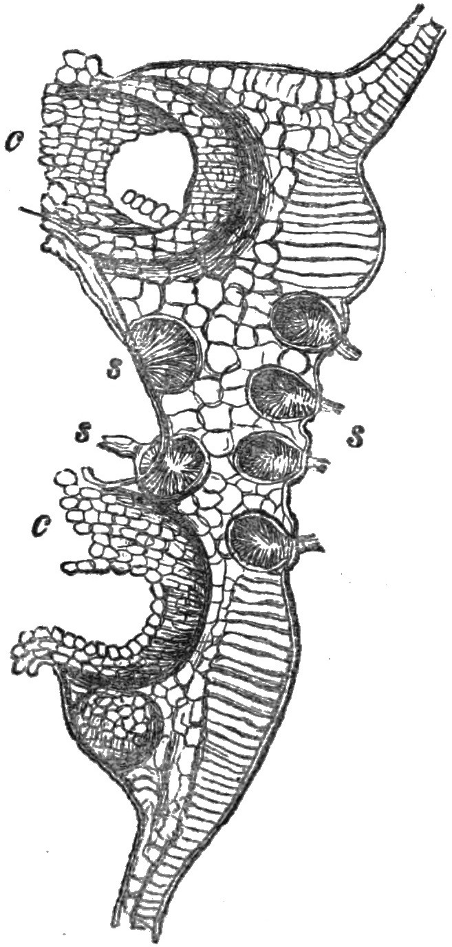 The third species occurs on the under surface of the leaves of the mountain-ash. The peridia are clustered on a rusty orange-coloured spot which is visible on the upper surface (Plate II. figs. 18, 19). They are long and cylindrical, with an evident tendency to curvature; the mouth is serrated, but not split up into threads, as in the species found on the hawthorn. There will often be found instead of well-developed peridia, what at one time were regarded as abortive peridia, forming a thickened orange or rust-coloured spot, studded with minute elevated points. These spots are clusters of spermogones, which organs are described in detail in our second chapter. The clusters and spores are of a brighter reddish-brown than in either of the other species. All are remarkably distinct, and perhaps the most curious and interesting of any that we have passed in review. To botanists, the species found on the hawthorn is known as Rœstelia lacerata, that on pear-leaves as Rœstelia cancellata, and the one on the leaves of the mountain-ash as Rœstelia cornuta.