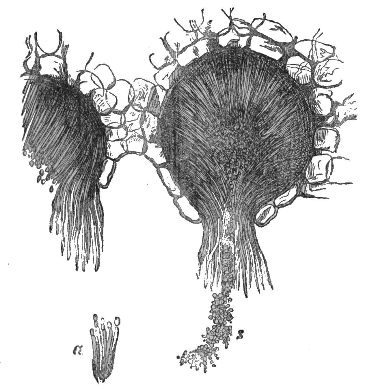 Fig. 2.—Section of ripe spermogones of Æcidium Euphorbiæ. s. Spermatia. a. Sterigmatæ bearing spermatia (De Bary).