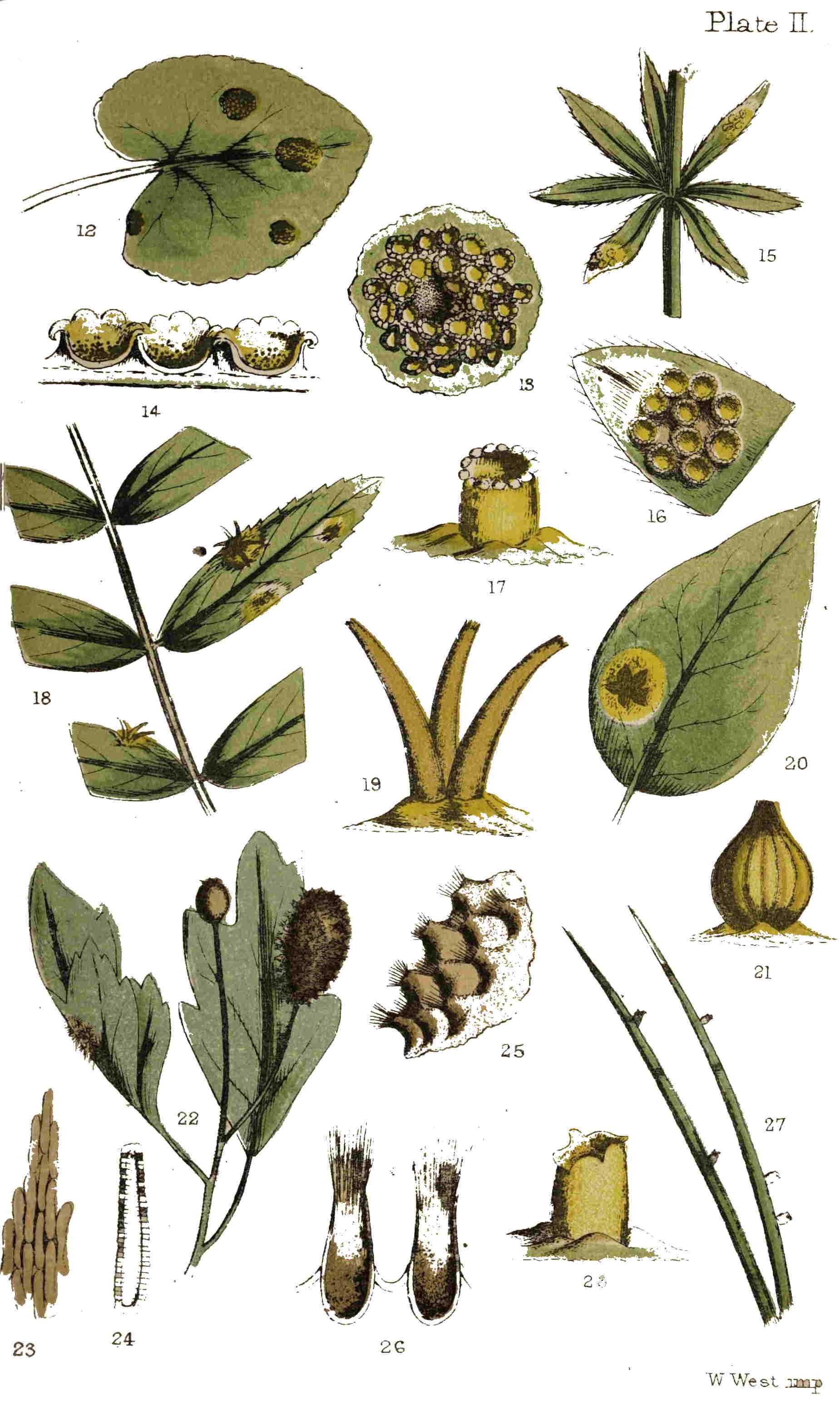 We have three species of fungi very similar in many respects to the foregoing, but differing in others to such an extent as to justify their association under a different genus and name. The hawthorn is a bush familiar to all who love the “merry month of May,” but it may be that its parasite has been unnoticed by thousands. If, for the future, our readers will bear this subject in their minds when they stand beneath a hawthorn hedge, they may become acquainted with clusters of singular brown pustules on the leaves, petioles, and fruit well worthy of more minute examination (Plate II. fig. 22). They scarcely claim the name of cups, and their lacerated and fringed margins rather 18resemble the pappus crowning the fruits of some composite plants than the cups of Æcidium. The peridia are very long, and split down throughout their length into thread-like filaments of attached cells; these gradually fall away and break up into their component parts till but short portions remain attached to the base of the peridia. These cells are elongated and marked on the surface with waved lines, forming in themselves pretty objects for a high power of the microscope (Plate II. figs. 23, 24). If the teeth of Æcidium resemble the peristome of some mosses, such as Splachnum; the threads of this species of Rœstelia, except in not being twisted, somewhat resemble the peristomes of other mosses of the genus Tortula. The spores in this species are less conspicuous, being of a light brown, and the whole plant, from its modest hue, may be readily passed over without attracting attention unless occurring in abundance.