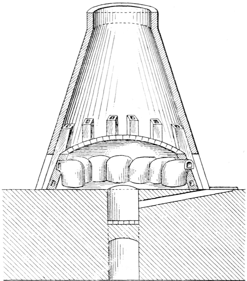 The whole batch is then put into barrels and conveyed to the glass house, where the furnace is situated. Here it is tipped into another arbour or box in a convenient position near to the melting pot, and, a proportional quantity of “cullet” being added, the mixture is then ready for filling into the pots. The stopper of the pot mouth is taken away and placed aside, and a man shovels the mixture or batch into the hot pot until it is full. He then replaces the stopper, and, after a few hours, when the first filling has melted and subsided, another filling of batch into the pot takes place until it becomes full of glass metal in its molten state. The batch melts with considerable ebullition, owing to the chemical reactions taking place under the heat of the furnace, giving off at the same time large quantities of gas. By the evolution of these gases the batch shrinks in volume so that it becomes necessary to fill a pot more than once with the batch before it becomes full of molten metal. The capacity of the pots varies between 250 and 1,200 kilogrammes, according to the type of glass and nature of the goods made.