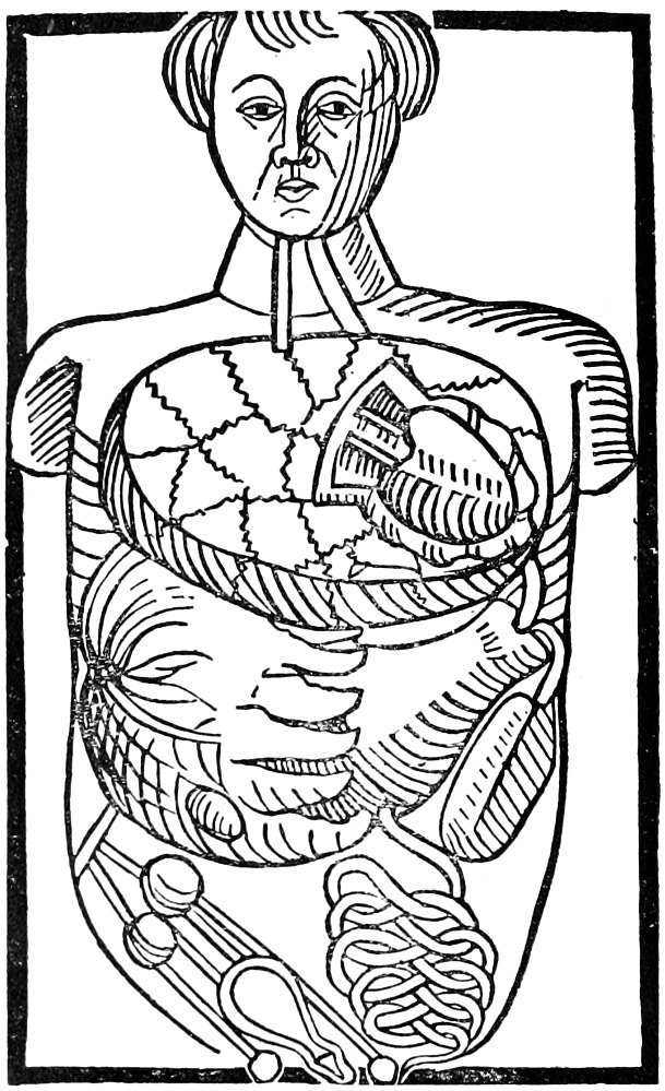 In 1316 Mondino issued his book which remained in manuscript form for more than one hundred and fifty 31 years, the first printed edition bearing the date 1478. Small and imperfect as it was, it marks an era in the history of science. By command of the authorities this book was read in all the Italian Universities. The work of Mondino contained no new facts; it was compiled largely from the writings of Galen and of Avicenna. The descriptions, to use the words of Turner, “are corrupted by the barbarous leaven of the Arabian schools, and his Latin is defaced by the exotic nomenclature of Ibn-Sina and Al-Rasi”. Mondino divided the body into three cavities, of which the upper contains the animal members, the lower the natural members, and the middle the spiritual members. Many of his names are borrowed from the Arab writers. Thus, he calls the peritoneum siphac, the omentum zyrbi, and the mesentery eucharus. His description of the heart is much nearer accuracy than would be expected. He resorted to vivisection, and tells us that when the recurrent nerves of the larynx are cut the animal’s voice is lost. In his book we find the rudiments of phrenology. He states that the brain is divided into compartments, each of which holds one of the faculties of the intellect.