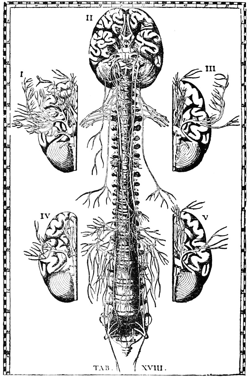 In myology Galen made numerous advances. “Previous to his investigations”, says Fisher[6] “much confusion existed as to what constituted a single muscle; he adopted the general rule of considering each bundle of fibers that terminates in an independent tendon to be one muscle. He was the first to describe and give names to the platysma myoides, the sterno- and thyro-hyoides, and the popliteal. He described the six muscles of the eye, two muscles of the eyelids, and four pairs of muscles of the 26 lower jaw—the temporal to raise, the masseter to draw to one side, and two depressors, corresponding to the digastric and internal pterygoid muscles. He described also the brachialis anticus, the biceps flexor cubiti, the sphincter and levator ani, and the straight and oblique muscles of the abdomen. In short, he described the greater portion of the muscles of the body, his treatise differing chiefly from a modern one in the minute account of these organs and in the omission of some of the smaller muscles.” Galen studied the brain and named the corpus callosum, the septum lucidum, the corpora quadrigemina and the fornix; but erroneously stated that the nerves of sensation arise from the brain, and those of motion from the spinal cord. He denied the decussation of the optic nerves. He described the pneumogastric and sympathetic nerves; seven pairs of cerebral and thirty pairs of spinal nerves; and claimed the discovery of the ganglia of the nervous system. He located the seat of the soul in the brain, which also is the source of the rational mind; the heart to him was the source of courage and of anger, and the liver was the seat of desire. Many of Galen’s anatomical statements show that he derived his knowledge from comparative dissections.