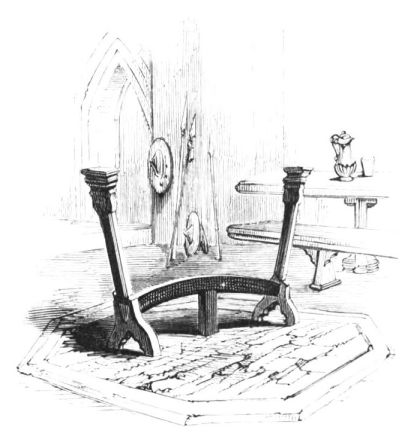 on the same side.[1] The wainscotting has been stained to imitate walnut-wood. The walls are adorned by several finely-painted portraits. Of the rooms on the upper floor there are none that demand especial notice: two of the bed-chambers are, however, hung with faded tapestry, concealing doors that lead to remote parts of the building. The antique damask bed-furniture and quilted coverlets are relics of ages long passed away. The Gallery, hung with old family portraits, extends nearly the whole depth of the mansion—being upwards of one hundred feet long by about eighteen wide, with oak{11} panels to the ceiling. A door-way in the court-yard conducts to a neat chapel, containing a window of stained glass, and an altar of fine Egyptian marble, inlaid with lapis lazuli. The venerable edifice