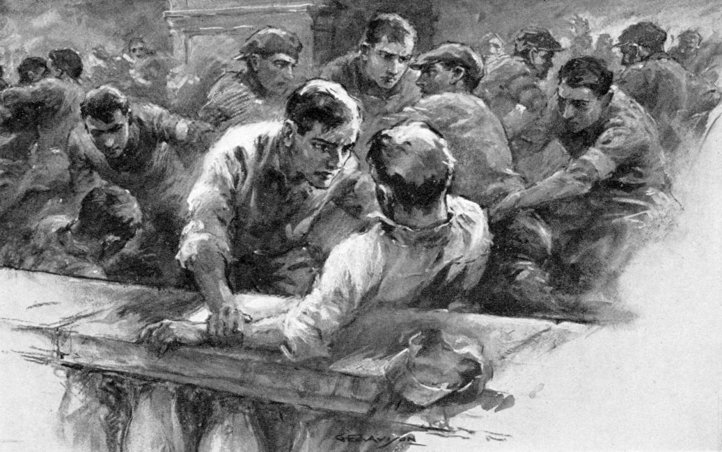 “Lots of other little stunts that you’ll absorb as you[6] come to ’em,” Merkle concluded; adding: “Of course, you’ll both be in the bridge scrap. You can’t do much but make a loud noise on the side-lines, because you’re not beefy enough”—meaning Dick; “but you”—with a nod for Larry—“you look fit enough to heave a locomotive off the track. Played on your High School eleven, didn’t you?”