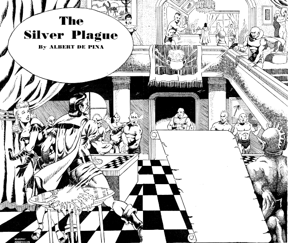 She wondered silently what new, macabre mission would be assigned to them this time. And hoped that the summons meant something far more than the usual battle between rival Societies striving to milk the venom from each other's fangs. For on at least three major Moons, Io, Europa and Callisto, men and women were struck by an invisible foe that left them trembling with fever, and when that dwindled away, a tide of silver rose from the roots of their hair, and even the eyes became luminous with the deadly patina. Nothing was known of Ganymede. It was hard to tell in the absence of reports, for Ganymede, aside from its own native civilization, had been colonized by Terran Mutants, who could and did procreate, thus perpetuating their race. But the victims of the Silver Plague were left sterile. It was hard to differentiate. Meanwhile the Moons were dying!