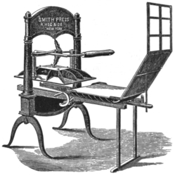 In 1822 Peter Smith, an American, connected with the firm of R. Hoe & Co. in New York, devised a machine which was in many respects superior to any up to that time. The frame was of cast-iron, and in place of the screw with levers, he substituted a toggle joint, at once simple and effective.