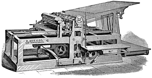 The news of these later inventions reached New York in due time, and in 1832 Robert Hoe, who had been some time established [18] in the manufacture of printing presses, sent a young man, Sereno Newton (whom he afterwards took in partnership with him), to England to investigate the subject and see what improvements were worthy of adoption. The result was the construction of the [19] machines known as the “Single Small Cylinder” and “Double Small Cylinder,” also the large Cylinder “Perfecting” Press, which have continued, with many alterations and improvements, to be manufactured up to the present time.