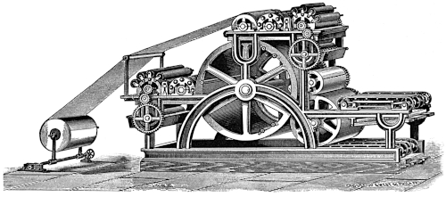 In this machine a folding apparatus was placed at each end to receive the product of the rolls, but in the machine with four impression cylinders only one folder was placed, at the end of the machine opposite that at which the paper entered.