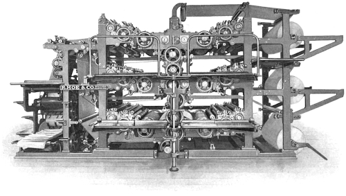 In 1888 was introduced a patented Hoe machine called the “Three-page-wide Press.” It has a capacity of printing, perfecting and delivering two-page papers, with one fold, at the rate of 60,000 per hour; four-page papers, with two folds, at 24,000 per hour, six-page papers at 24,000 per hour; eight-page papers, folded twice, or to carrier size, at 12,000 per hour, and twelve-page papers, folded in the same manner as the eight-page, at the same speed, viz., 12,000 [71] per hour; all the supplement sheets being inset and pasted if desired.