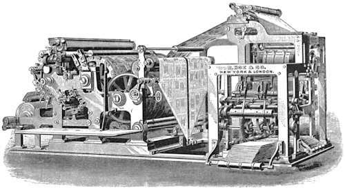 Among the most interesting modern printing machines are those constructed by Hoe & Co. at their London works, after drawings and patterns sent from New York, for weekly English journals, such as “Tit-Bits,” “Sunday Stories,” and similar periodicals. These machines embody to a certain extent the principles of the “Double Supplement” press before referred to. Double sets of plates are placed upon the main machine, which is capable of taking on an aggregate of twenty-four pages; and by using narrower rolls the number of pages of the body of the journal may be reduced to sixteen or twenty, so that the publisher may have the option of printing his paper either sixteen, twenty or twenty-four pages. In addition to this it prints a cover on a different colored paper, and all at the rate of 24,000 copies per hour; the whole product, including the cover, being cut on the edges and pasted together at the back. The supplement or cover of the press portion, however, instead of having two pairs of cylinders, as in the “Double Supplement” machine, consists of one form cylinder and one impression cylinder. This portion of the machine prints the cover, which is fed from a narrower roll, and, as before stated, of an entirely different color or quality of paper from the body of the journal. The form for one side of the cover is placed on one end of the form cylinder, and [81] that for the other side on the other end of the cylinder. This ingenious combination results in the printing of one cover to every copy of the journal issued and no more.