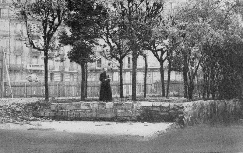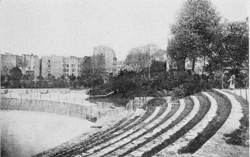 Somewhere south of the palace and not far from it was a garrison to protect the suburb and the Cité from southern invasion. That it was not greatly needed during this peaceful and prosperous period seems proved by the fact that Lutetia’s amusement ground was not within its easy reach, but on the eastern slope of Mons Lucotetius. Here at some time during the Roman occupation, perhaps during the second or third century, an amphitheater was built, and here emperors and generals and merchants, Romans and Gauls, gazed upon the pageants and contests of the arena. Christianity wrought a milder mood in her believers and even before the invasion of the Franks the stone seats of the ellipse had been converted to other uses. Enough was discovered, however, some thirty
