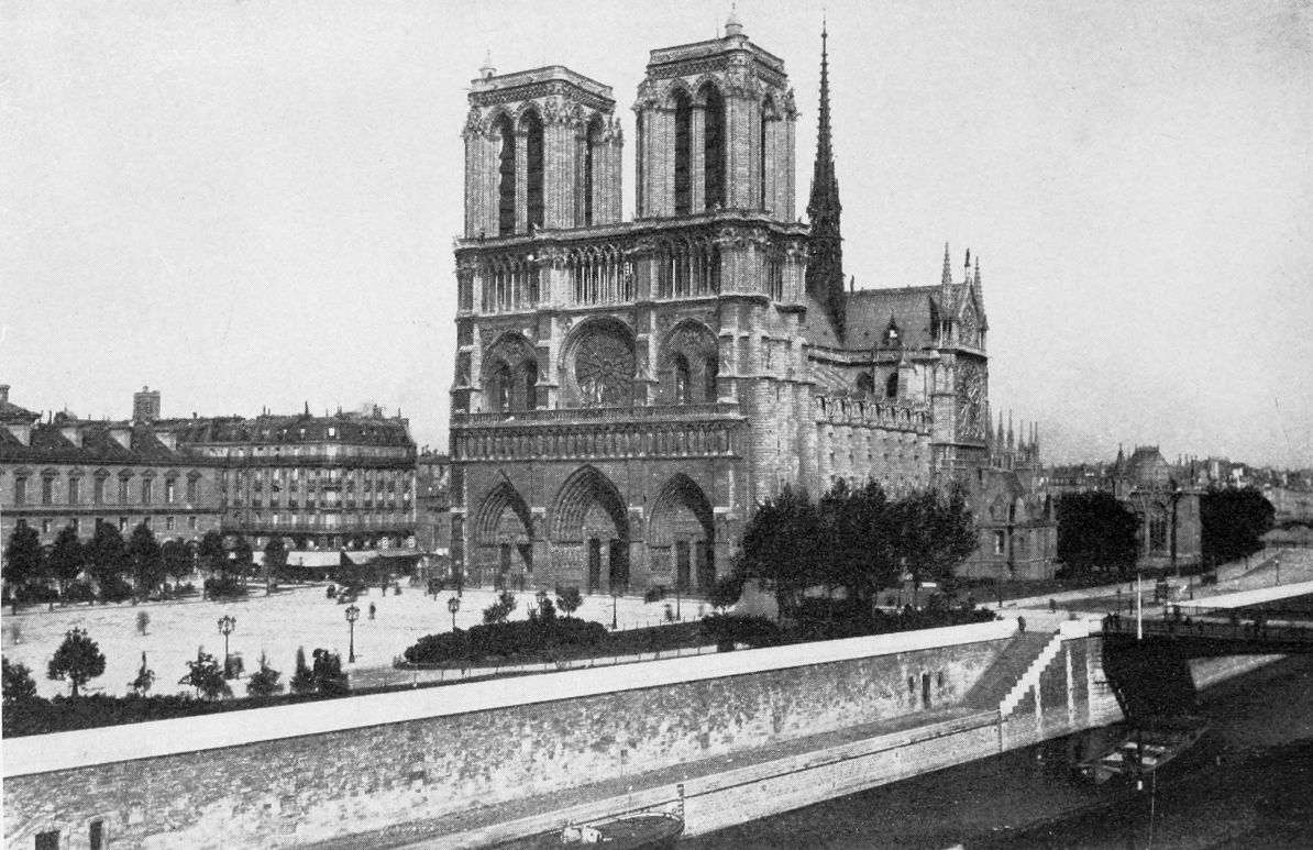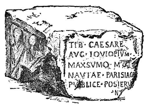 The cathedral was a church dedicated to Saint Étienne, modest as compared with its medieval successor, Notre Dame, whose sacristy is placed on the same spot, yet showing that concentration of the arts in their expression of religious spirit which has made the churches of Europe at once the treasure-house of the student and the devotee, the inspiration of the poet, and the joy of the lover of color and of line. Both of these Christian churches have stood on ground already dedicated to religion, for under the choir of Notre{12} Dame there was discovered in 1711 a pagan altar, now the chief relic of the museum in the Thermes. The inscription on the stone places it in the reign of the emperor Tiberius (14-37 A.D.), the successor of the great Augustus. Its inscription reads: “When Tiberius was emperor the Parisian Watermen publicly raised this altar to Jupiter, best and greatest.”