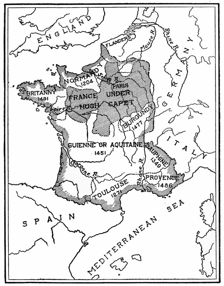 NEVER in all its many troubled days has France been more in need of a wise head and a steady hand than it was when in 987 the lords gave to Hugh Capet the name of King of France. He was already Count of Paris and Duke of France, that is, of the Île de France, the district around Paris. When he was chosen king the title meant only that a few powerful nobles promised him their fidelity. Back of this insignificant fact, however, loomed the idea of kingship remembered from the Roman days of centralized power. Combined with this idea was the governing principle of the new feudalism which emphasized the duty of every man to be loyal to his superior with obedience and support, to his inferior with protection. Thus the title of king meant much or little in proportion as the holders of great possessions lived up to their oaths of allegiance. The weakness of the royal person was the foundation weakness of the feudal system which{45}