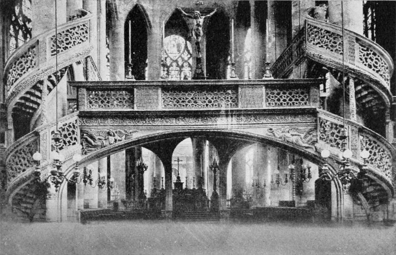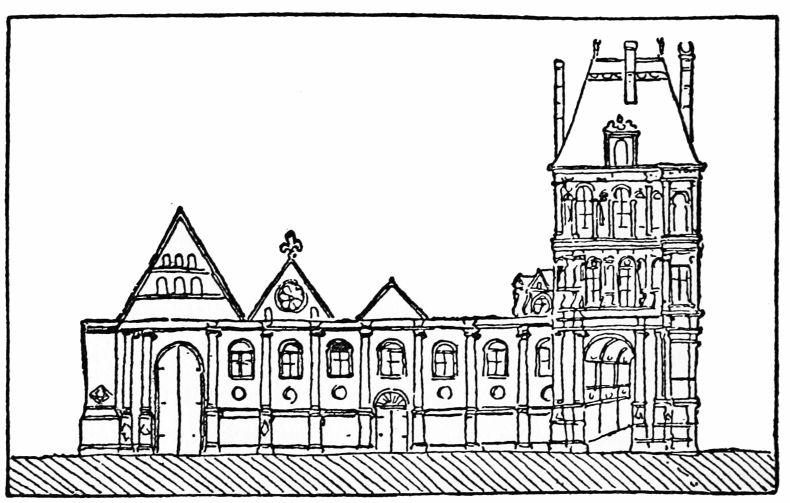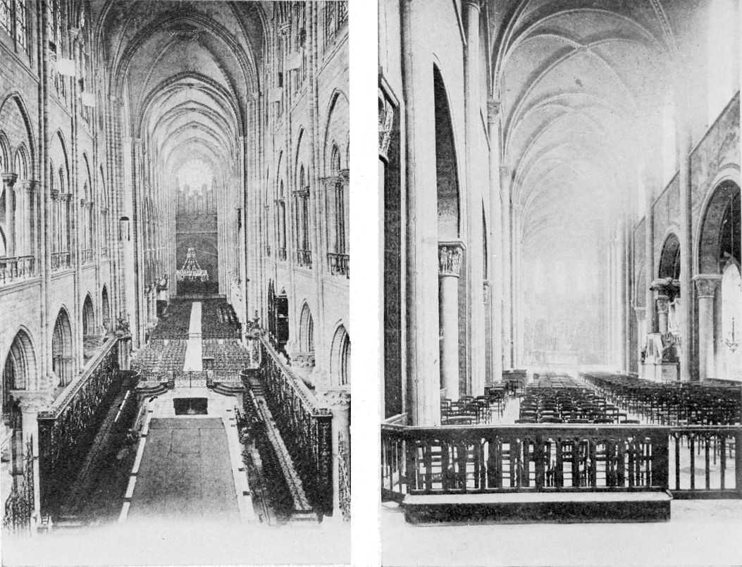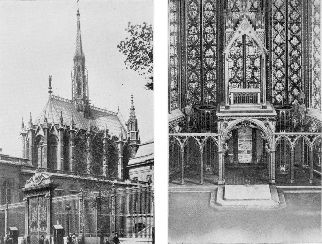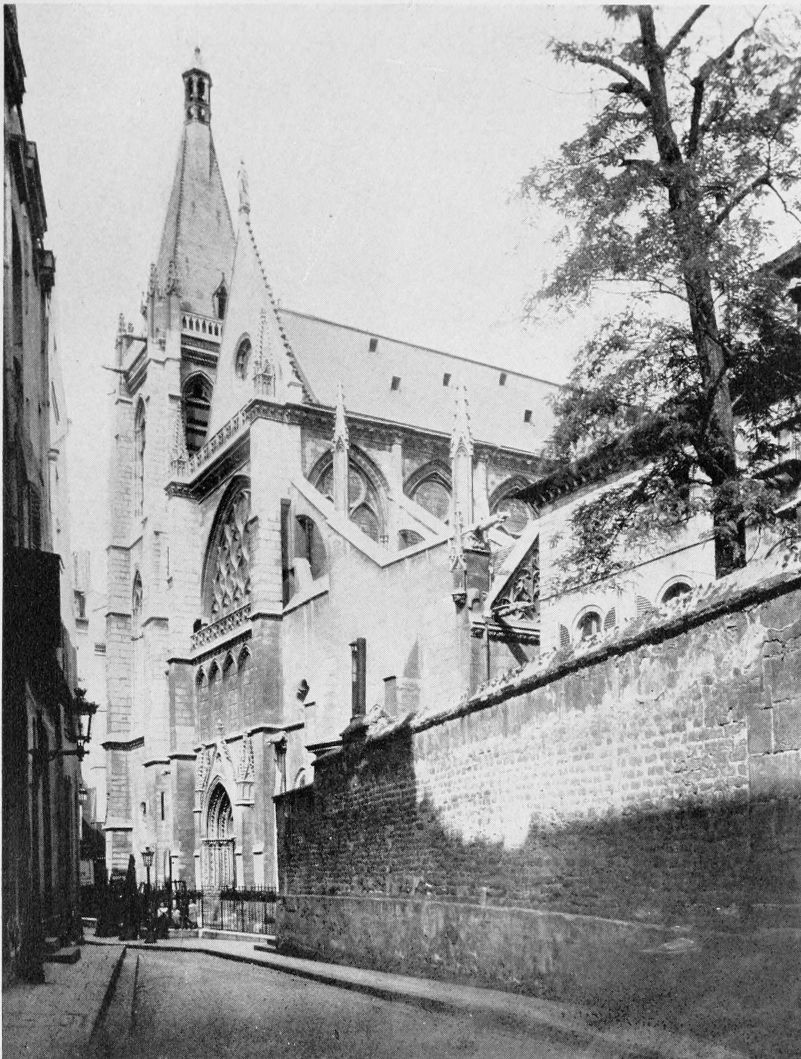 Henry I (1031-1060), no weakling but not{53} a man of administrative ability, followed his father’s example as a builder. One of his benefactions was the Priory of Saint Martin-des-Champs which was begun in the last year of his reign on the site of a former establishment which had been destroyed by the Normans. It lay well out of the city on the old Roman road leading to the north and was a huge place, a fortified village in itself and quite independent of Paris. A wall of considerable size furnished with round towers surrounded an enclosure in which were a church, a refectory, a cloister, a chapter-house, an archive tower, a field for the pasturing of cattle, gardens for the raising of vegetables, and a cemetery for the burial of the dead. The wall has gone to-day except for one of the round towers which was preserved and rebuilt through the intercession of Victor Hugo when the straightening of a street called for its destruction. The field and gardens and the cemetery are now hidden beneath houses and pavements, but the church, whose erection lasted from the eleventh to the thirteenth century, and the refectory, finished in the thirteenth century, have been preserved as parts of the Conservatoire des Arts et Métiers, established by the Convention in 1794 as a technical school and museum of machines and scientific instruments. The church, secularized, serves as an exhibition hall{54} for machinery, an incongruous and somewhat shocking combination. The refectory is put to the more suitable use of housing the technical library. Both are exquisite examples, and the church is the oldest existing instance in the city, of that Gothic architecture which sprang into being in the twelfth century as if to symbolize with its stretching height and its soaring spires, its delicate workmanship and its brilliancy of light and coloring, the aspiration toward the high and the beautiful which filled men’s desires after they came in contact with the appealing mysticism and the dazzling loveliness of the East.