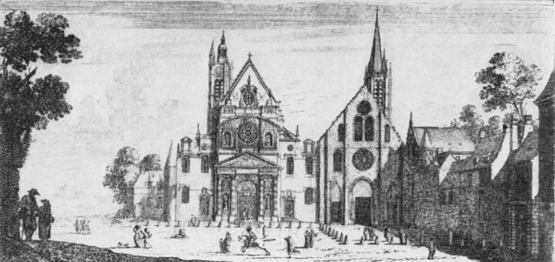 It was about the middle of the third century that the altar to greatest Jupiter began to be deserted by its worshipers, for it was then that Saint Denis came to Paris to preach the new religion, and with his coming and the Emperor Constantine’s conversion Christian churches began to be built. Even the martyrdom of Saint Denis, who, according to Gregory of Tours, “ended his earthly life by the sword,” was no check to believers. Legend has it that his head was stricken off on Montmartre, the hill towering above Paris on the north, and to-day crowned by the pearl-white dome of the basilica of the Sacré Coeur gleaming, mysterious, through the city’s eternal haze. The hill’s name has been said to mean “Mount of Mars,” because of a pagan altar raised upon its summit, or “Mount of the Martyr,” referring to the death of Saint Denis. Either derivation may be defended, and neither contradicts the story that the holy Bishop of Paris, decapitated, picked up his head and carried it for several miles before a kindly-disposed woman offered him burial. Over his remains a chapel was{14} raised, restored about two centuries later by Sainte Geneviève, and replaced in 630 by the basilica which Dagobert I (602-638) erected to house fittingly that most holy relic, the head of the saint. The existing church was begun about five hundred years later by Suger, the minister of Louis VI who adopted the oriflamme of Saint Denis as the royal standard of France. The flag hung above the altar and was used only when the king went into battle himself. Since the English victory on the field of Agincourt (1415) it has not left the church. The banner (in replica) stands to-day in the choir behind and to the left of the high altar. Throughout the church are the tombs of the Kings of France from Dagobert to Louis XVIII—twelve centuries of royal bones.