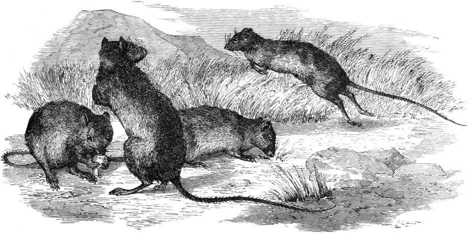 | THE MOUSE-LIKE RODENTS—MYOXIDÆ—Characteristics—THE DORMOUSE—Description—Habits—Activity—Food—Winter Condition—THE LOIR—THE GARDEN DORMOUSE—LOPHIOMYIDÆ—How the Family came to be Founded—THE LOPHIOMYS—Milne-Edwards’ Opinion—Skull—General Form—Habits—MURIDÆ—Number of Species—Characteristics—Variety of Forms—Distribution—The Murine Sub-Family—THE BROWN RAT—History—Fecundity and Ferocity—Diet—At the Horse Slaughter-houses of Montfaucon—Shipwrecked on Islands—Story of their Killing a Man in a Coal-pit—In the Sewers of Paris and London—THE BLACK RAT—THE EGYPTIAN RAT—THE COMMON MOUSE—Habits—Destructiveness—Colours—THE LONG-TAILED FIELD MOUSE—Description—Food—THE HARVEST MOUSE—Description—Habits—In Winter—Agility—Their Nest—THE BANDICOOT RAT—THE TREE RAT—THE STRIPED MOUSE—Allied Genera—THE WHITE-FOOTED HAPALOTE—The American Murines—THE WHITE-FOOTED, OR DEER MOUSE—THE GOLDEN, OR RED MOUSE—THE RICE-FIELD MOUSE—THE AMERICAN HARVEST MOUSE—THE FLORIDA RAT—Description—Their Nest—Food—Mother and Young—THE BUSHY-TAILED WOOD RAT—THE COTTON RAT—THE RABBIT-LIKE REITHRODON—THE HAMSTERS—Characteristics—Appearance—Distribution—Burrows—Disposition—Food—Habits—THE TREE MICE—THE BLACK-STREAKED TREE MICE—THE GERBILLES—Characteristics—Habits—Other Genera—THE WATER MICE—Characteristics—Species—THE SMINTHUS—THE VOLES—Characteristics—THE WATER VOLE—Appearance—Distribution—Food—THE FIELD VOLE—THE BANK VOLE—THE SOUTHERN FIELD VOLE—THE SNOW MOUSE—THE ROOT VOLE—THE MEADOW MOUSE—THE PINE MOUSE—THE MUSQUASH, MUSK RAT, OR ONDATRA—Distinguishing Features—Habits—His House—THE LEMMING—Description—Food—Habits—Disposition—Their Extraordinary Migrations—Other Lemmings—THE ZOKOR | |