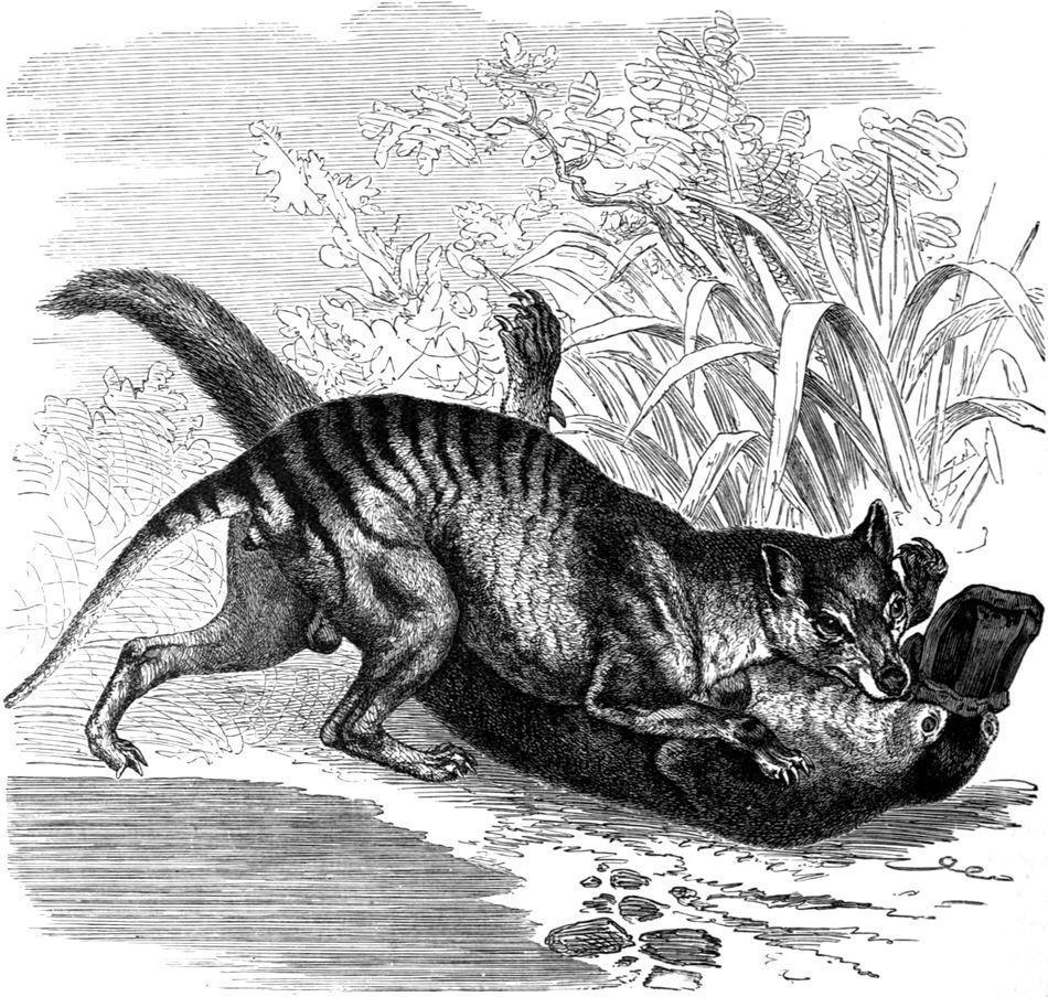 | THE PHALANGER FAMILY—THE KOALA—Habits—Characteristics—THE CUSCUS—THE VULPINE PHALANGER—THE DORMOUSE PHALANGER—Habits—Remarkable Characters—THE FLYING PHALANGERS—Its Flying Machine—Habits—THE SQUIRREL FLYING PHALANGERS—Habits—The Parachute-like Membrane—Exciting Scene on board a Vessel—Characteristics—THE OPOSSUM MOUSE—THE NOOLBENGER, OR TAIT—A Curiosity among Marsupials—Distinctive Features—THE POUCHED BADGER FAMILY—Characteristics—THE RABBIT-EARED PERAMELES—THE BANDICOOT—THE BANDED PERAMELES—THE PIG-FOOTED PERAMELES—Discussion regarding it—Characteristics—THE DASYURUS FAMILY—Characteristics—THE POUCHED ANT-EATERS—THE BANDED MYRMECOBIUS—Description—Great number of Teeth—History—Food—Habits—Range—THE URSINE DASYURE—Appearance—“Native Devil”—Ferocity—Havoc among the Sheep of the Settlers—Trap to Catch them—Its Teeth—A True Marsupial, though strikingly like the Carnivora—Skeletal Characters peculiar to itself—MAUGE’S DASYURE—THE DOG-HEADED THYLACINUS—Description—Resemblance to the Dog—Habits—Peculiarities—THE BRUSH-TAILED PHASCOGALE—Description—Other Varieties | |