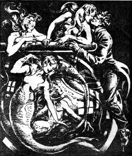 From the waist up they were pocket-editions of perfectly-formed girls. Their eyes were amber, with the sparkle of a coquette, their hair luxuriantly long and golden. Silver nails tipped each tiny finger and the silver was repeated in the gleaming scales which covered the tapering lower half of the graceful bodies.