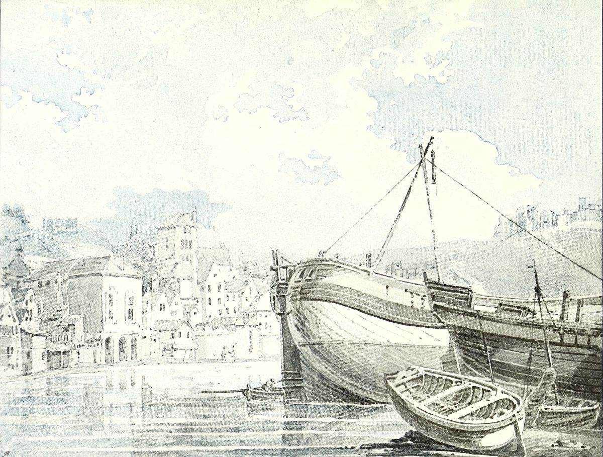 From 1793 to 1796 Turner’s advance in power was steady. His subjects were varied—English and Welsh cathedrals, old castles, ruined abbeys, village churches, country towns, waterfalls and trout streams—the latter generally with a bridge and always with an angler. He was himself a keen fisherman, and his anglers’ attitudes are always carefully drawn and at once recognisable. Occasionally some striking atmospheric effect, seen probably on the spot, is introduced. Sometimes the picture is strikingly enhanced by the play of sunlight, occasionally by boldly treated chiaroscuro. The architecture is invariably drawn with accuracy and taste, both as regards perspective and detail. His colouring was a dainty harmony of broken tints in pale blues, greens, browns, and neutral greys. Many good drawings of this time are in private collections, and the Print Room of the British Museum contains some fine examples which have been preserved from light, and are consequently in perfect, unfaded condition—notably Lincoln and Worcester Cathedrals, and Tintern Abbey. Most of the English cathedrals were drawn by him between 1793 and 1796, including, in addition to the two just named, Canterbury, Ely, Peterborough, Rochester, Salisbury, and York; as well as Bath, Kirkstall, Malmesbury, Malvern, Tintern, Ewenny, Llanthony, Waltham and many other abbeys, together with castles innumerable—all in the delicate, “tinted manner.” He also made a large number of studies of boats and shipping at Dover, one of which is reproduced here (Plate IV.). It was probably there and at Margate that he laid the foundation of the extraordinarily accurate knowledge of everything connected with the sea and shipping which distinguished him all his life.