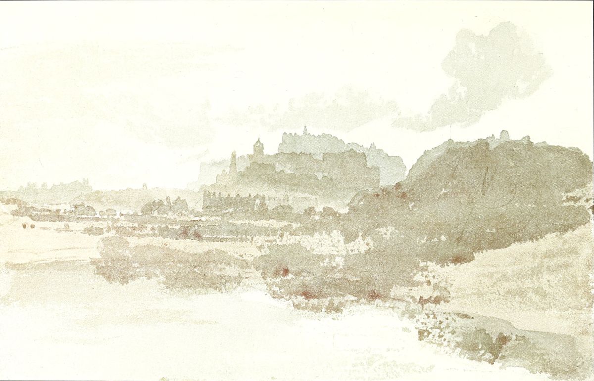 In 1818 Turner went North to make drawings for “The Provincial Antiquities of Scotland,” an important illustrated work in which Sir Walter Scott, then in the height of his Waverley fame, was keenly interested, and for which he was gratuitously writing the letterpress. Sir Walter wished the illustrations to be given to a fellow Scotsman, the Rev. John Thomson, of Duddingston, an able landscape painter, but the publishers insisted that Turner’s was the name in vogue with the public, and the work was accordingly divided. The drawings, which are all highly finished and of fine quality, are entirely of Lowland scenery, including Bothwell, Crichton, and Roslyn castles, three or four Edinburgh subjects—one, Edinburgh from the Calton Hill, very striking—and the seaside fortresses of Tantallon and Dunbar. They were afterwards presented by the publishers to Sir Walter in recognition of his services in ensuring the success of the book, and they remained at Abbotsford until quite recent years.