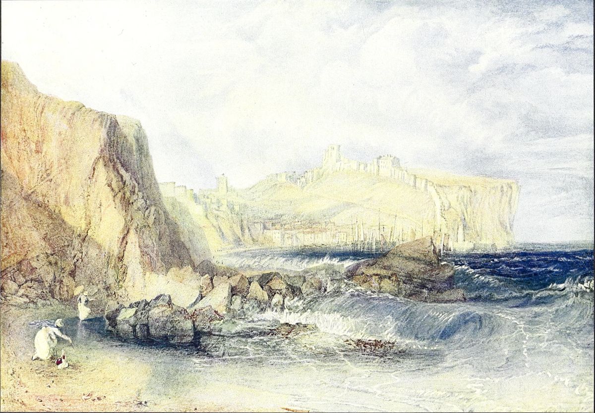 One of Turner’s earliest series of book illustrations was his “Southern Coast of England,” which he began about 1812 and continued to 1826. He agreed with W. B. Cooke, a fine line-{15}engraver and an enterprising publisher, to supply forty drawings of views along the coast, from the Nore on the east to the Bristol Channel on the west; many other leading water-colour artists of the day—De Wint, Clennell, Prout, and others—being also contributors. Turner was to receive seven and a half guineas apiece for the drawings, which were of small size; but although this price was soon raised to ten, and later to twelve guineas, he became dissatisfied, and broke with Cooke, who, however, judging from the correspondence, appears to have treated him fairly. He had, moreover, given him many other commissions for drawings and had held exhibitions of these, and the engravings from them, at his rooms in Soho Square.