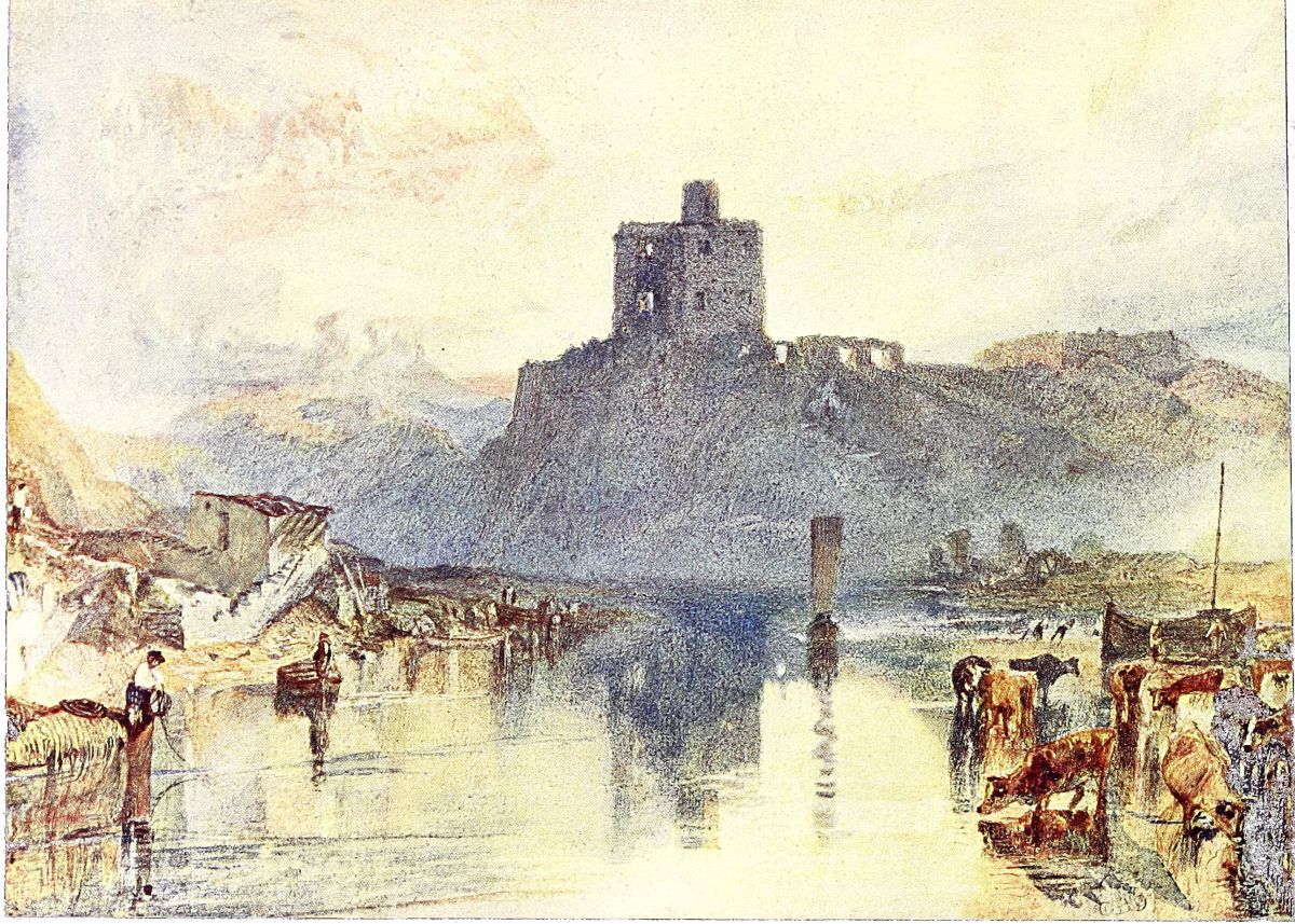 In 1824 we find Turner at work on the well-known “Rivers of England,” the drawings for which, along with its companion series{19} “The Ports of England,” have for so many years—too many, alas, for their welfare—been exposed for long periods and daily copied at the National Gallery. These show a richer and more elaborate colour-scheme, as compared with the simpler work of the “Yorkshire” period. An example, the Norham Castle (No. XIV.), is given here. Both series were well reproduced in mezzotint on steel, which metal had just begun to supersede copper for engraving.