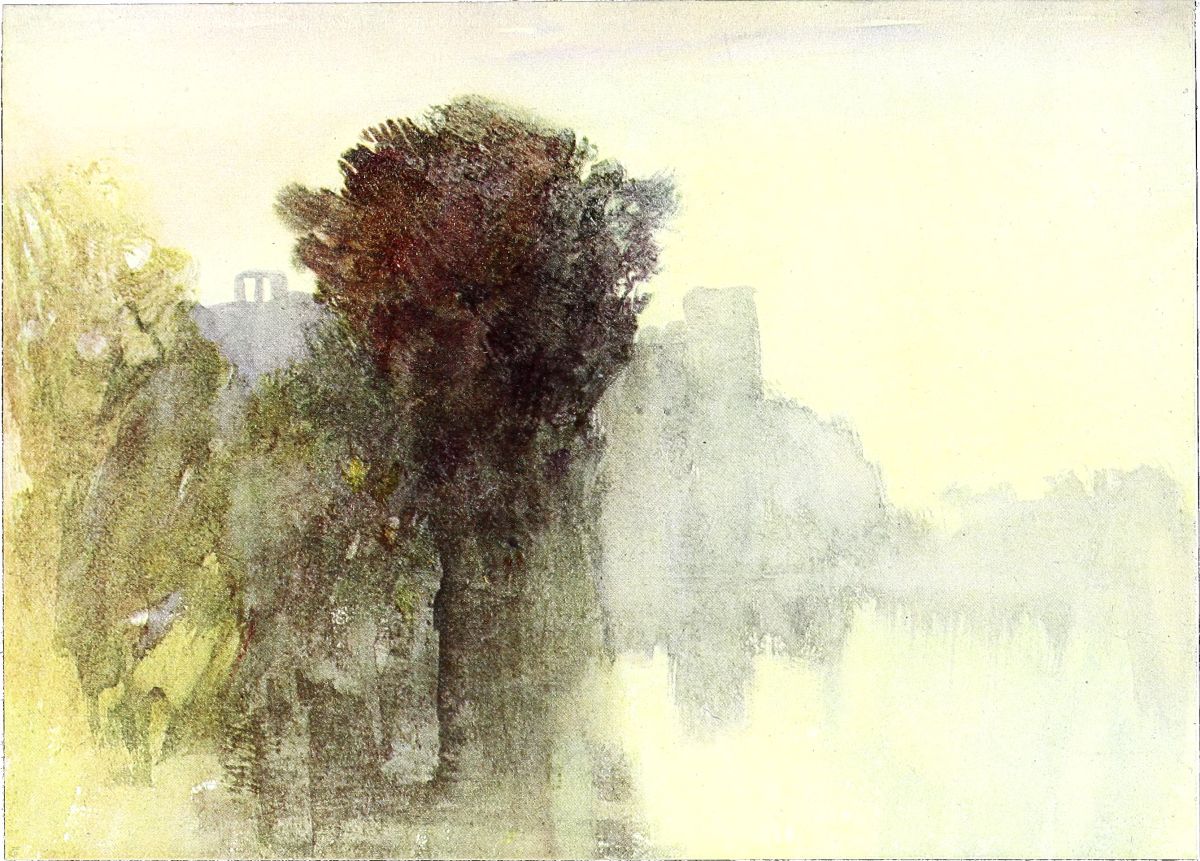 Little has hitherto been said as to Turner’s technique in water-colour although the subject is one of great interest, but, unfortunately,{23} my point of view is solely that of a student, and technique can only be adequately dealt with by an artist. Much valuable information, however, on the question will be found in Redgrave’s “Century of Painters,” Vol. I., and in Roget’s “History of the Old Water-Colour Society.” From the first he was a great innovator, choosing his materials and often inventing his methods without regard to custom, precedent, or anything but the attainment of the precise effect which he desired at the time. Signs of scraping, spongeing, the use of blotting-paper, etc., are constantly to be seen in his drawings. In some, including one in my own possession, the marks of his thumb are distinctly visible in places. But the result always justified the means employed! With his oil pictures, especially those painted after 1830, his experiments, as we know, were often disastrous in their ultimate effects, but it is extremely rare to find any of his water-colours which have suffered in the smallest degree when they have been properly kept. But alas, as has already been pointed out, only too many, and amongst those some of the finest, have been, and still are being, irretrievably damaged and changed by continual exposure to light, both in Public Galleries and on the walls of their owners.
