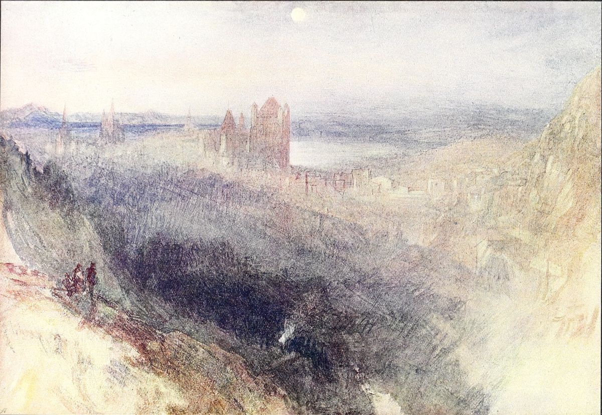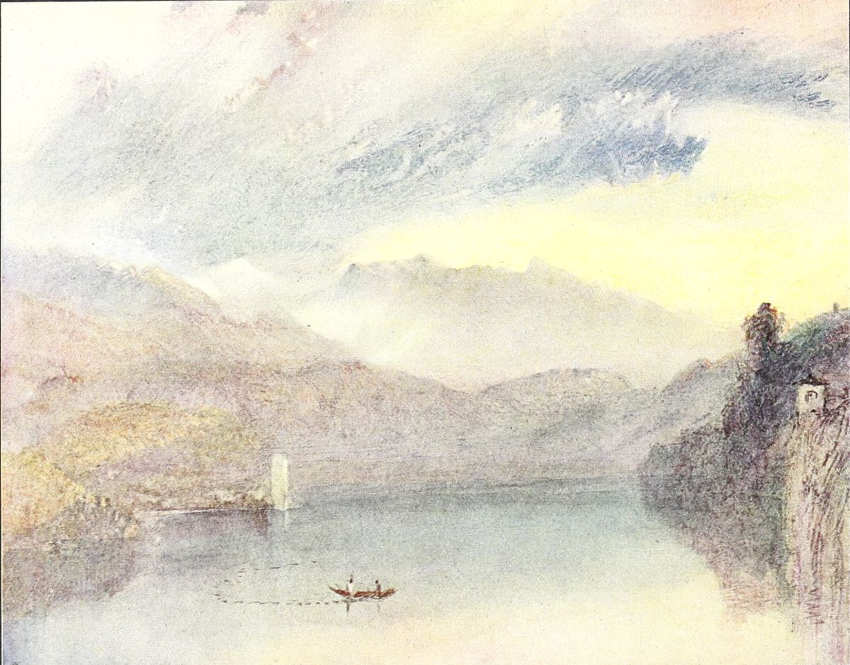 From 1838 to 1845, when his health began to fail, he spent an increasing time each year on the Continent, and it was during this period that his water-colour art passed into what many regard as its highest, as it was its latest phase. I refer especially to the magnificent Sketches of this time, the large majority of which are in the National Gallery. He revisited Venice, which had cast her enchantment on him in earlier years, and he returned again and again to the Lake of Lucerne, which, after Yorkshire, was probably, up to the last, of all places in the world the dearest to his heart. It would be difficult to say how many times he drew the town, the lake, the mountains, and especially the Righi. There are the Red Righi, the Blue Righi, the Dark Righi, the Pale Righi, and a hundred other versions—each different, each a ‘vision of delight.’ He made{21} drawings also in many neighbouring parts of Switzerland, Piedmont, and Savoy.