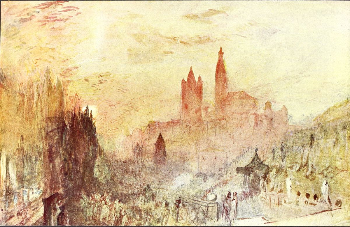 A new phase in his water-colour art of 1830-1836 calls for notice, viz., his numerous small drawings for vignette illustrations, the first and the most important of which were for the far-famed plates of Rogers’s “Poems” and “Italy.” The drawings for these are markedly different from any of his previous work, and many of them strike what I cannot but regard as an unpleasant note. Marvels of execution, delicate, highly imaginative, and poetical in feeling as they are, they are often strangely forced and extravagant in colour. And this applies to nearly all his drawings for vignettes. Probably his reason for thus falsifying his colour was connected with the form of engraving, as at the same time he was producing some of his finest and sanest work for the “England and Wales,” “Turner’s Annual Tours” (now better known as the “Rivers of France”) and other engravings of ordinary (not vignette) shape. Whatever may have been his motive, it appears to{20} me that owing to this unnatural colouring, the exquisitely engraved vignettes themselves are in many cases finer than the drawings for them.