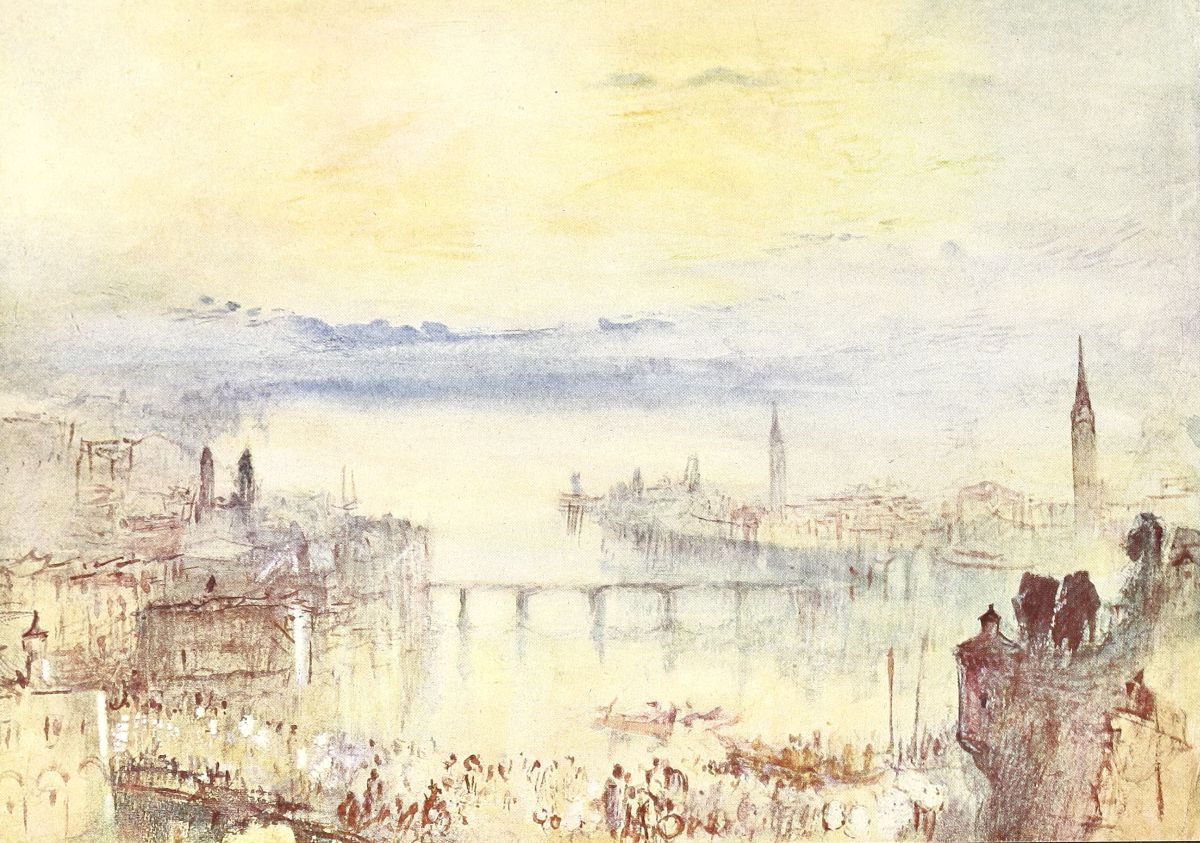 Nor has the work of his later years always been understood in our days. Not many years ago a distinguished German oculist{22} read a paper at the Royal Institution which was afterwards published in which he endeavoured to prove that what he considered eccentricities of colour in Turner’s later oil pictures were due—not to his attempts to paint the unpaintable—but to a senile affection of his eyes, which caused an unnatural distortion of his vision to yellow in everything. But Professor Liebreich can hardly have been aware that although the oil pictures upon which he rested his theory, being mainly attempts to depict objects or scenery seen in full sunlight, necessarily tended towards yellow as their prevailing colour, yet at the very same time, and up to his death, Turner was daily producing the sanest, most delicate, most refined water-colour drawings in the palest as well as the deepest tones of every colour on his palette! All the Swiss, Venetian and other sketches of 1838 to 1845, which are the crowning glory of the Water-Colour Rooms in Trafalgar Square, were executed during the period when, according to Professor Liebreich, Turner’s sight was permanently and hopelessly affected! No doubt he recognised that water-colour was unsuited as a medium for his new aim at painting pure light, and confined himself accordingly, for such subjects, to oil painting.