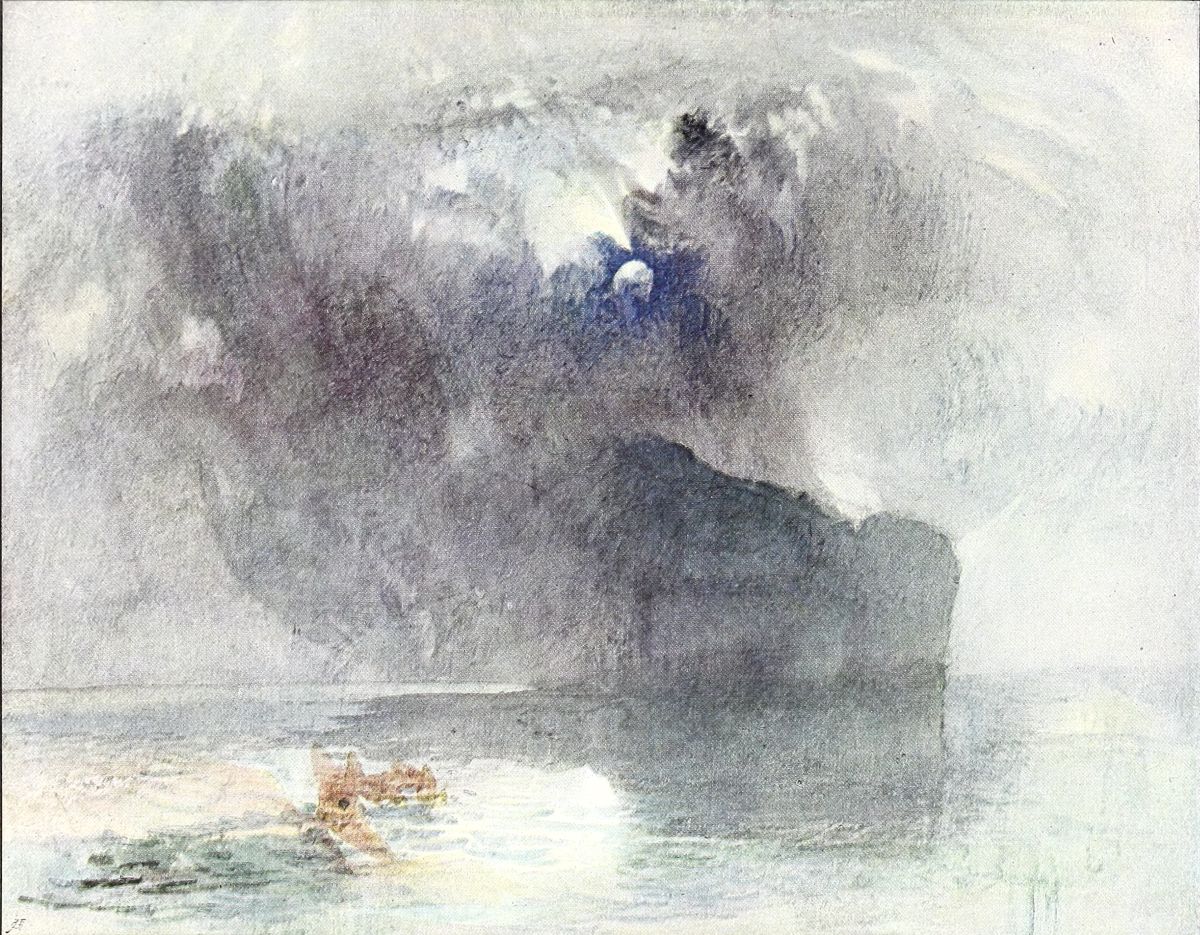 This last phase of Turner’s art was, however, at the time neither understood nor appreciated, probably owing largely to the new development which had recently taken place in his oil pictures. In these he had set himself, in his old age, the last and hardest tasks of his life—the painting of pure light, of swift movement, of the tumultuous, elemental forces of Nature. Some of the Venice subjects, the marvellous Snow Storm at Sea, and the Rain, Steam and Speed, were entirely misunderstood and ridiculed. “Blackwood’s Magazine” led the attack, and “Punch” and Thackeray added their satire. No doubt several of his late oil pictures were far-fetched in subject, fantastic in treatment, and eccentric in colour. Probably, also, no one knew better than he that he had not reached the goal of his ambition; but he also knew that his critics understood his aims as little as they did the difficulties which he had to encounter in striving to reach them, and the old man felt the attacks keenly. Ruskin tells us that he came one evening to his father’s house in Denmark Hill, after an especially bitter onslaught on the Snow Storm at Sea—Vessel in Distress off Harwich, of 1842, which the critics had described as “soapsuds and whitewash.” Ruskin heard him, sitting in his chair by the fire, muttering to himself at intervals “Soapsuds and whitewash,” again and again and again. “At last,” he says, “I went to him asking, ‘Why he minded what they said?’ Then he burst out ‘Soapsuds and whitewash! What would they have? I wonder what they think the sea’s like. I wish they’d been in it.’” As a matter of fact, Turner had actually been on board the boat at the time lashed to the mast, at the risk of his life.