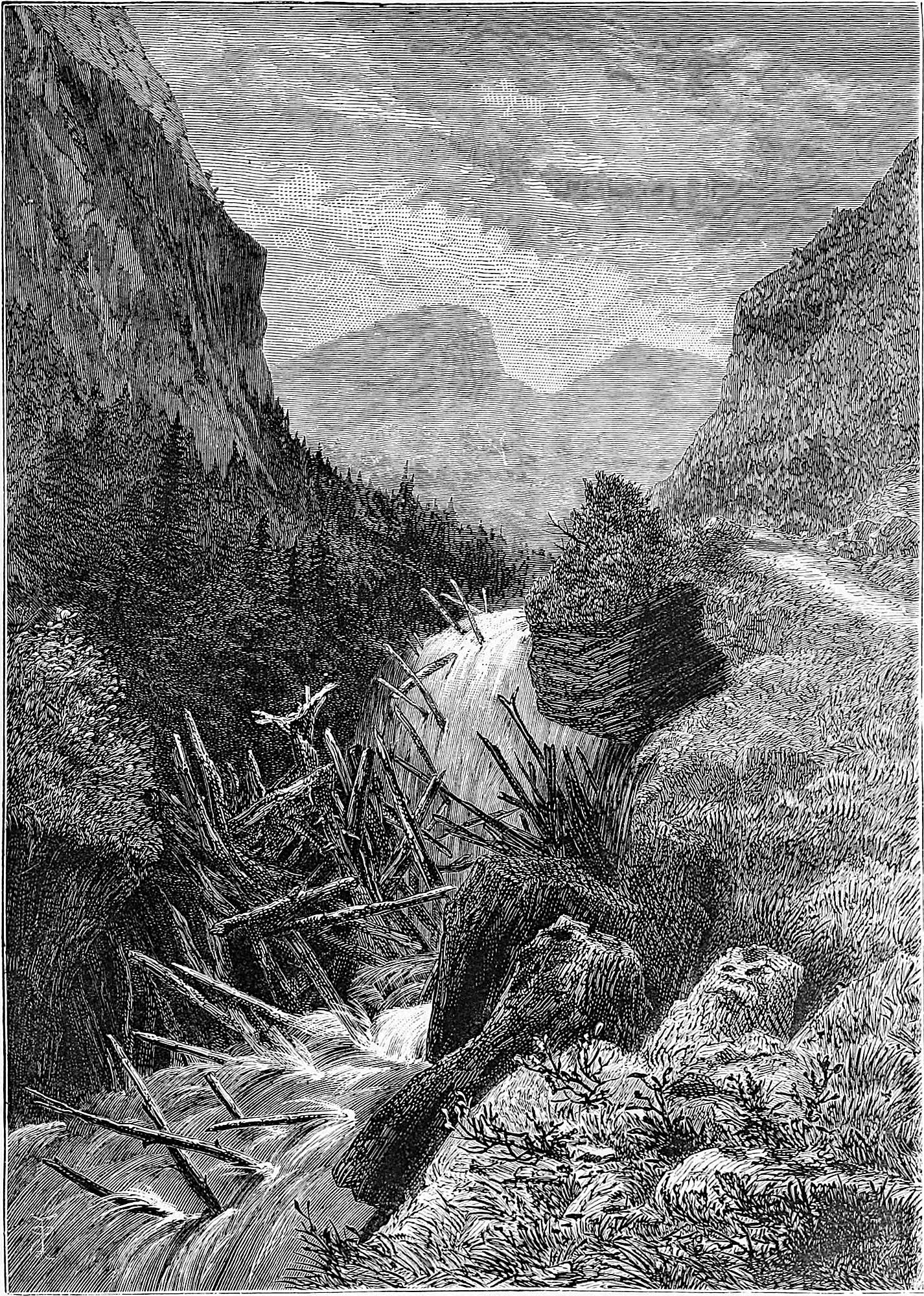 Between Christiania and Kongsberg much timber is seen wending its way down to the fjord. An instance of a timber jam after a shoot is given in the accompanying illustration. Sometimes trees are torn away at flood-time. The regular timber is duly marked and started, and at certain periods of the year persons follow the course of the river for the purpose of releasing the jams and helping the timber on its way to Drammen, where it is shipped for all parts of the world.