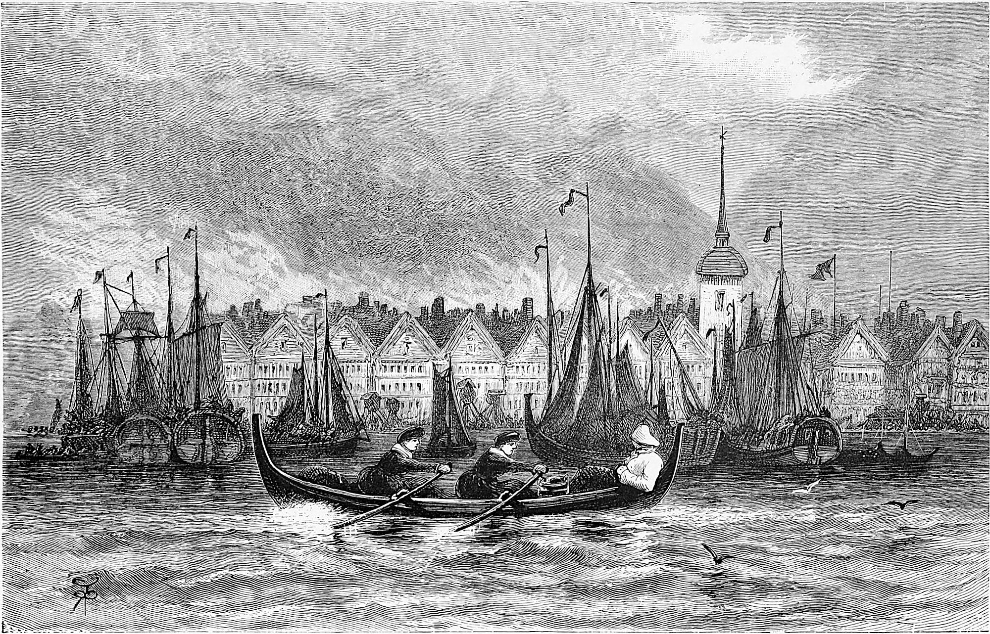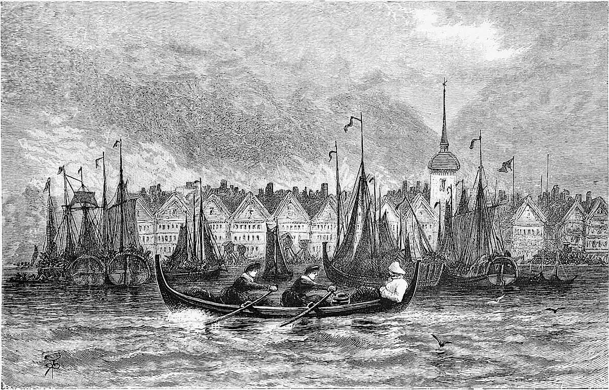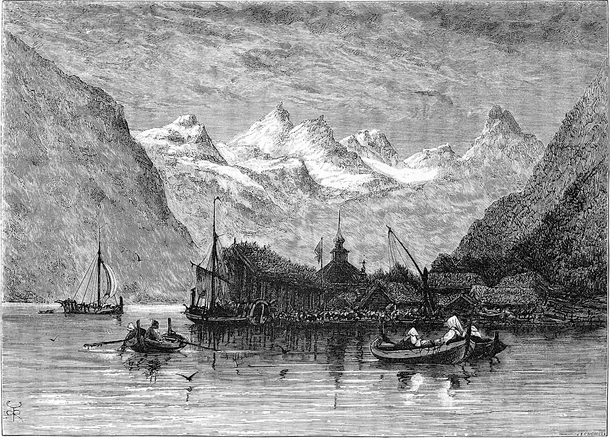 We were soon at the Victoria Hotel, with its quaint courtyard, with galleries running round it, excessively tame pigeons hopping and perching on all sides, and a reindeer head nailed to the woodwork. During the tourist season a large marquee is erected in the centre of this courtyard for tables d’hôte and extra meals. In the meantime we hurried to our rooms, longing to be out in a boat for a general view of the city. A few extras were, however, requisite before starting in real earnest, amongst which were two rifle slings. These had to be made, and are referred to here because they were the means of initiating us into one of the customs of the place. The leather slings were well made, but the price was most tolky (exorbitant). This led to a mild remonstrance, upon which the saddler wrote us a remarkable letter, which it is a pity we cannot present verbatim. It was to the effect that the saddler was happy to serve us well, but thinking we were English gentlemen, he imagined we should prefer giving English prices. However, if we merely wished to pay in accordance with the Norwegian tariff, it would only be so much, which was precisely the amount we did pay.