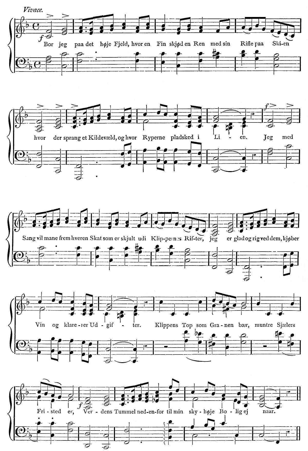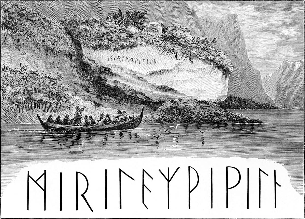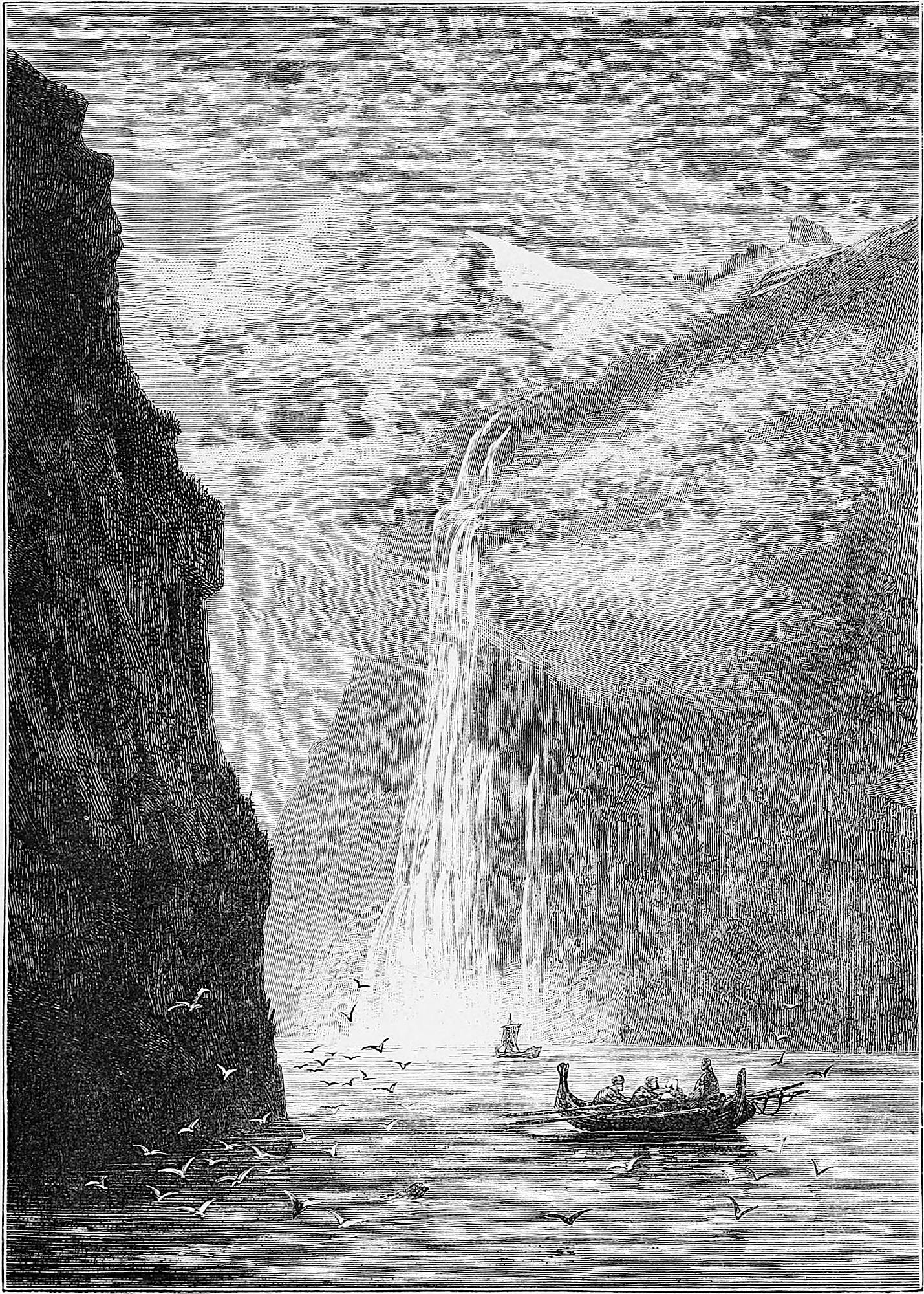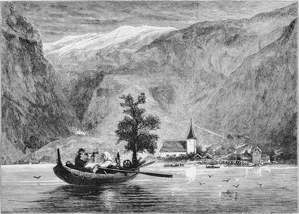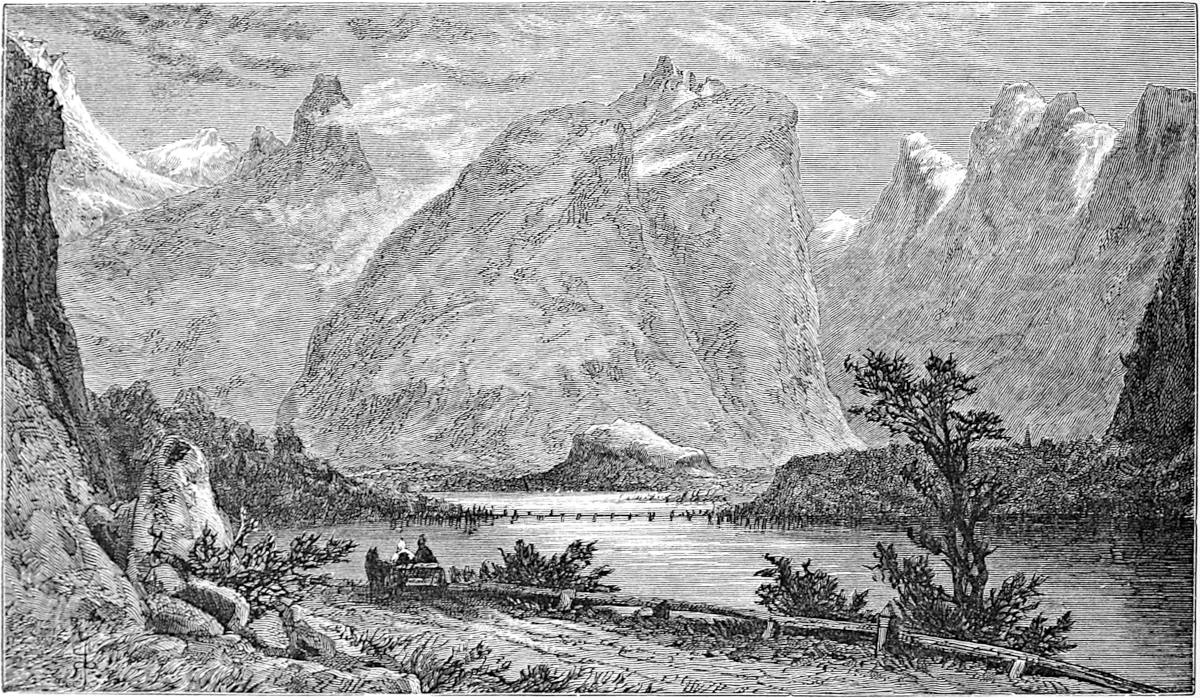 To visit Oscar’s Hall the most pleasant way is to take a boat and row across. This was suggested by Hans, and we were glad to find that he took kindly to boat work, as he came from Gudbransdalen, which is inland. More pleased, however, were we to discover, when about half-way across, that Hans was gradually bursting out into song, singing in a clear voice one of Kjerulf’s sweetest compositions, which we give in part at the end of the chapter. There is a plaintive sweetness throughout it, and the beauty of the evening, coupled with the surprise, caused us to anticipate 13many future repetitions, as nothing, when travelling, is more humanising and soothing than vocal or instrumental music.