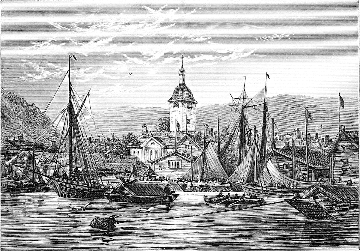 The first port touched en route for the capital of Norway is Christiansand, which is snugly hidden in the extreme south of the district of Sætersdalen—that land of eccentricity in costume and quaintness of habitation, of short waists and long trousers reaching to the shoulders, above which come the shallow, baby-looking jackets. With what zest does one strain for the first peep at a seaport of a foreign land! What value is attached to the earliest indication of varying costume, or even a new form of chimney! The steamer from Hull generally arrives at Christiansand on Sunday, when it is looking its neatest, the white tower of the church shining over the wooden houses of the town, the Norwegian shipping all in repose, with the exception, perhaps, of the heavy, compressed, Noah’s ark kind of dumpy barges, or a customs’ gig containing some official. As we looked up at the church tower we could8 not but wonder if we should hear, during our short visit, the whistle of the “Vægter;” for tradition says that, for the protection of the place, a watchman is always on the look-out, ready to give the alarm should a fire break out in the town, which, being built almost entirely of wood, would soon be reduced to a heap of ashes. But no; we heard no whistle, not even a rehearsal. On dit that for three hundred years has the Vægter looked out afar, and no alarum has issued from the tower. Christiansand has been mercifully preserved from fire, and long may it be so!