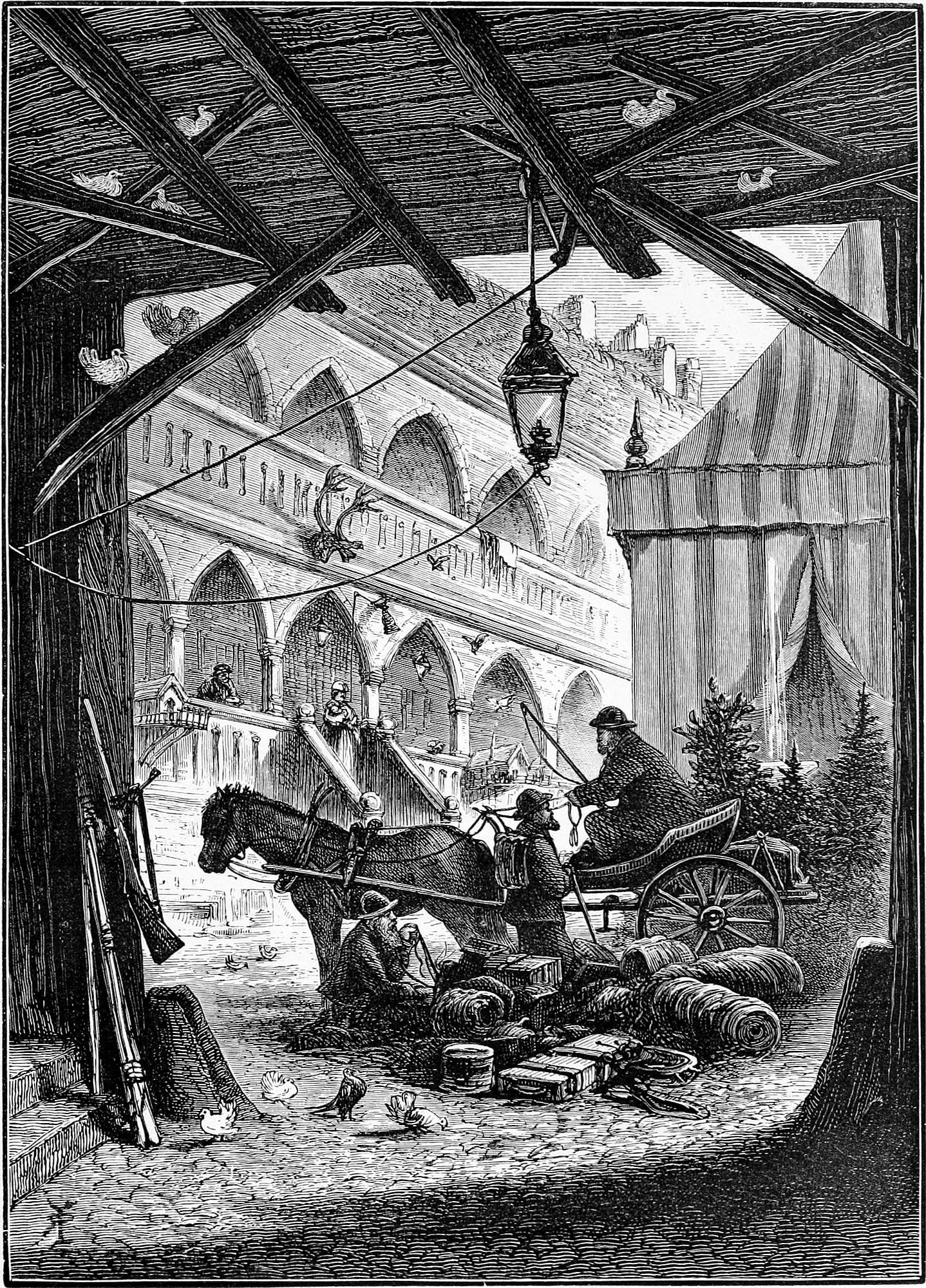 We were soon at the Victoria Hotel, with its quaint courtyard, with galleries running round it, excessively tame pigeons hopping and perching on all sides, and a reindeer head nailed to the woodwork. During the tourist season a large marquee is erected in the centre of this courtyard for tables d’hôte and extra meals. In the meantime we hurried to our rooms, longing to be out in a boat for a general view of the city. A few extras were, however, requisite before starting in real earnest, amongst which were two rifle slings. These had to be made, and are referred to here because they were the means of initiating us into one of the customs of the place. The leather slings were well made, but the price was most tolky (exorbitant). This led to a mild remonstrance, upon which the saddler wrote us a remarkable letter, which it is a pity we cannot present verbatim. It was to the effect that the saddler was happy to serve us well, but thinking we were English gentlemen, he imagined we should prefer giving English prices. However, if we merely wished to pay in accordance with the Norwegian tariff, it would only be so much, which was precisely the amount we did pay.