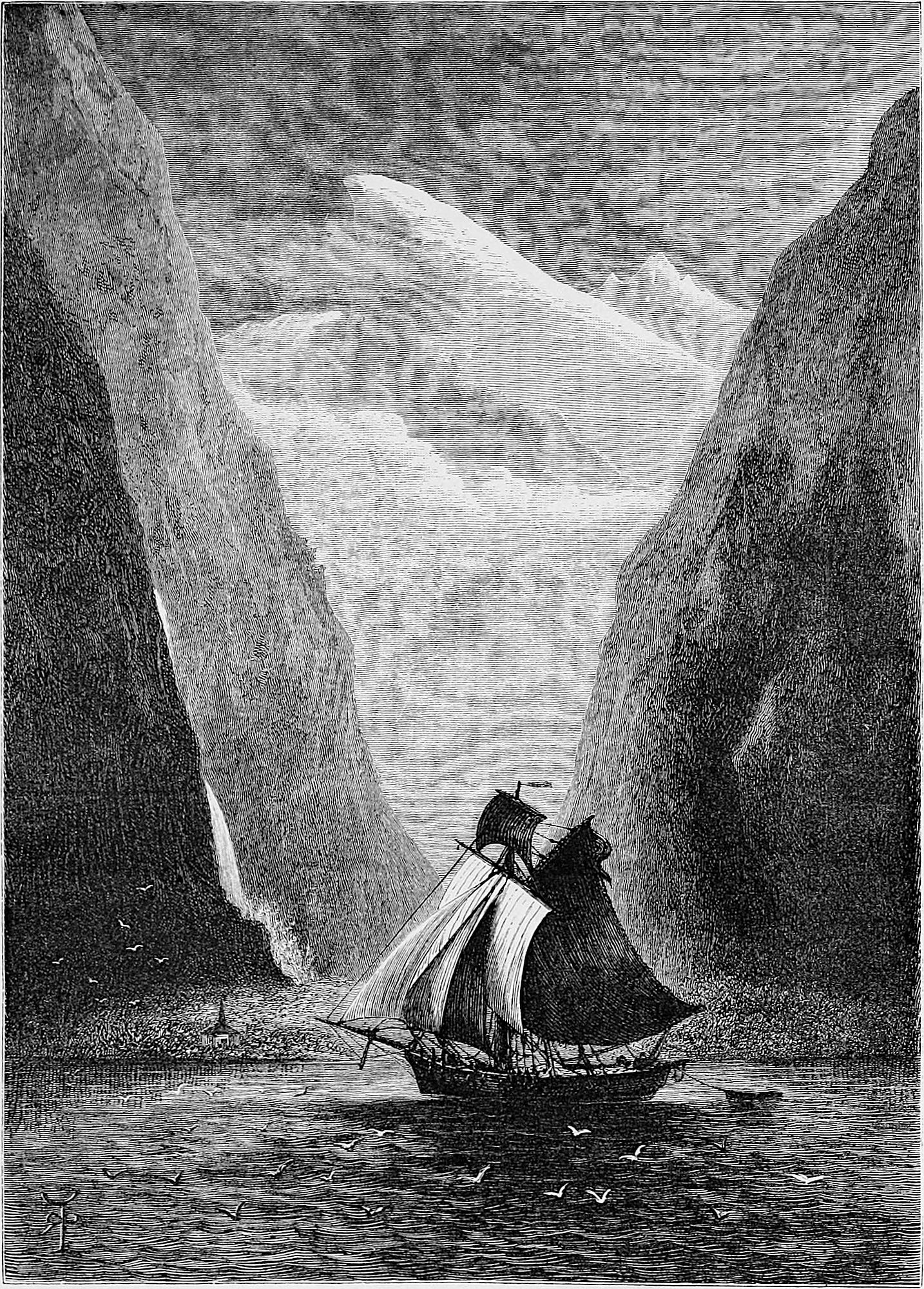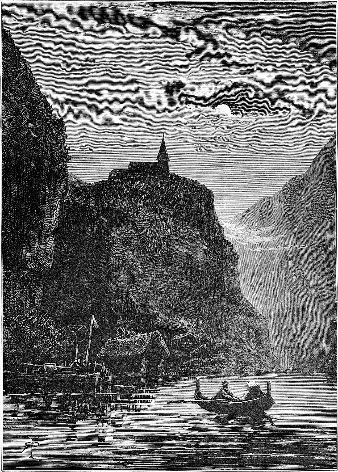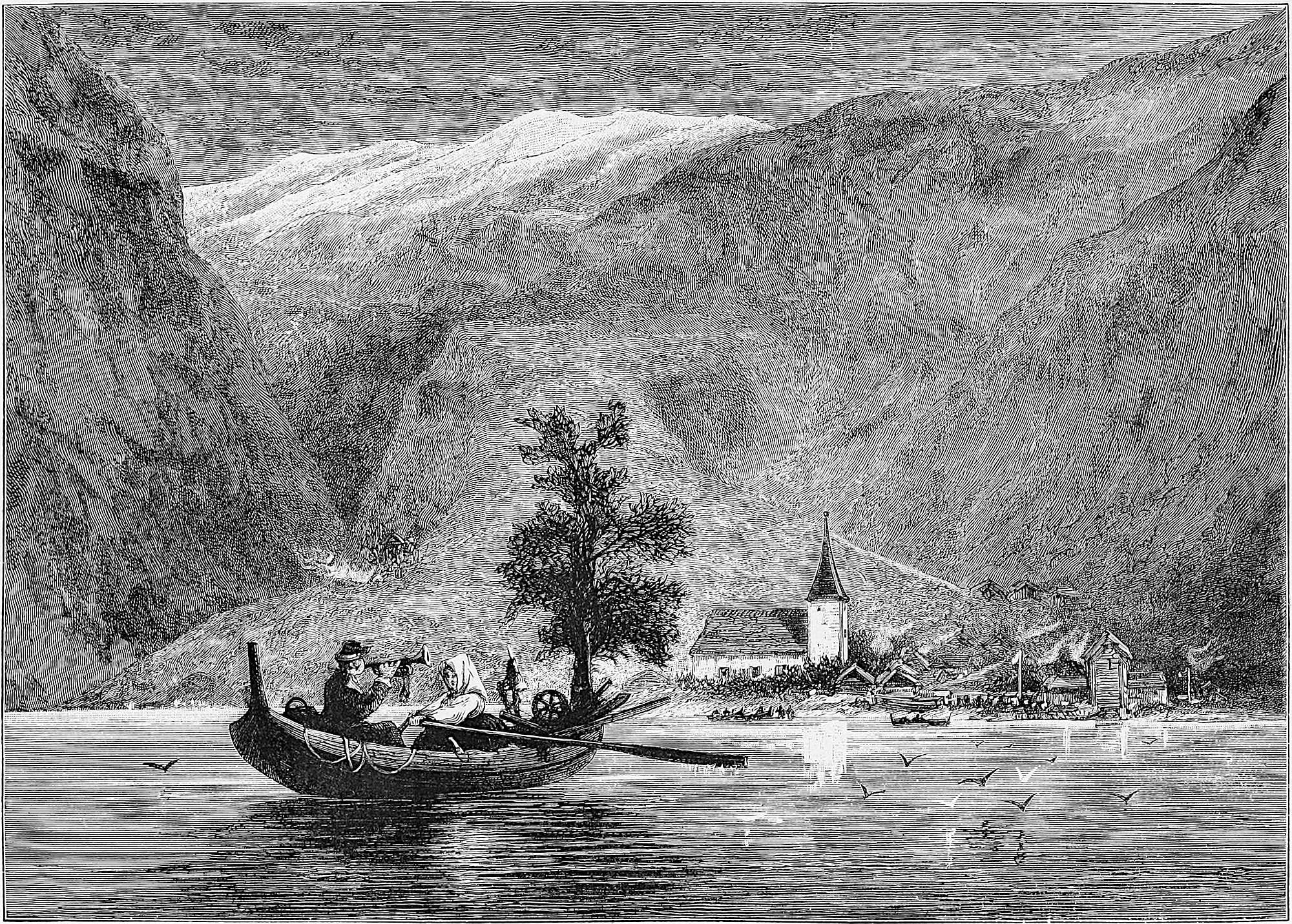 To visit Oscar’s Hall the most pleasant way is to take a boat and row across. This was suggested by Hans, and we were glad to find that he took kindly to boat work, as he came from Gudbransdalen, which is inland. More pleased, however, were we to discover, when about half-way across, that Hans was gradually bursting out into song, singing in a clear voice one of Kjerulf’s sweetest compositions, which we give in part at the end of the chapter. There is a plaintive sweetness throughout it, and the beauty of the evening, coupled with the surprise, caused us to anticipate 13many future repetitions, as nothing, when travelling, is more humanising and soothing than vocal or instrumental music.