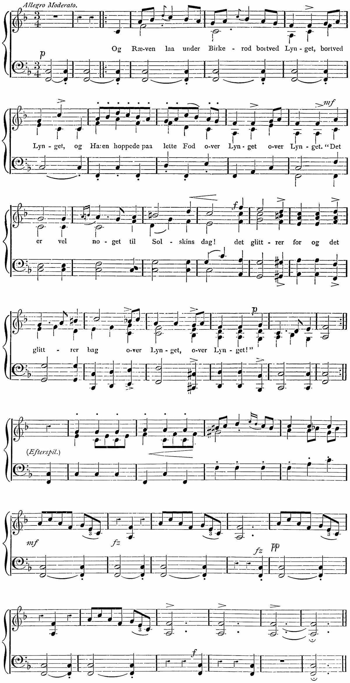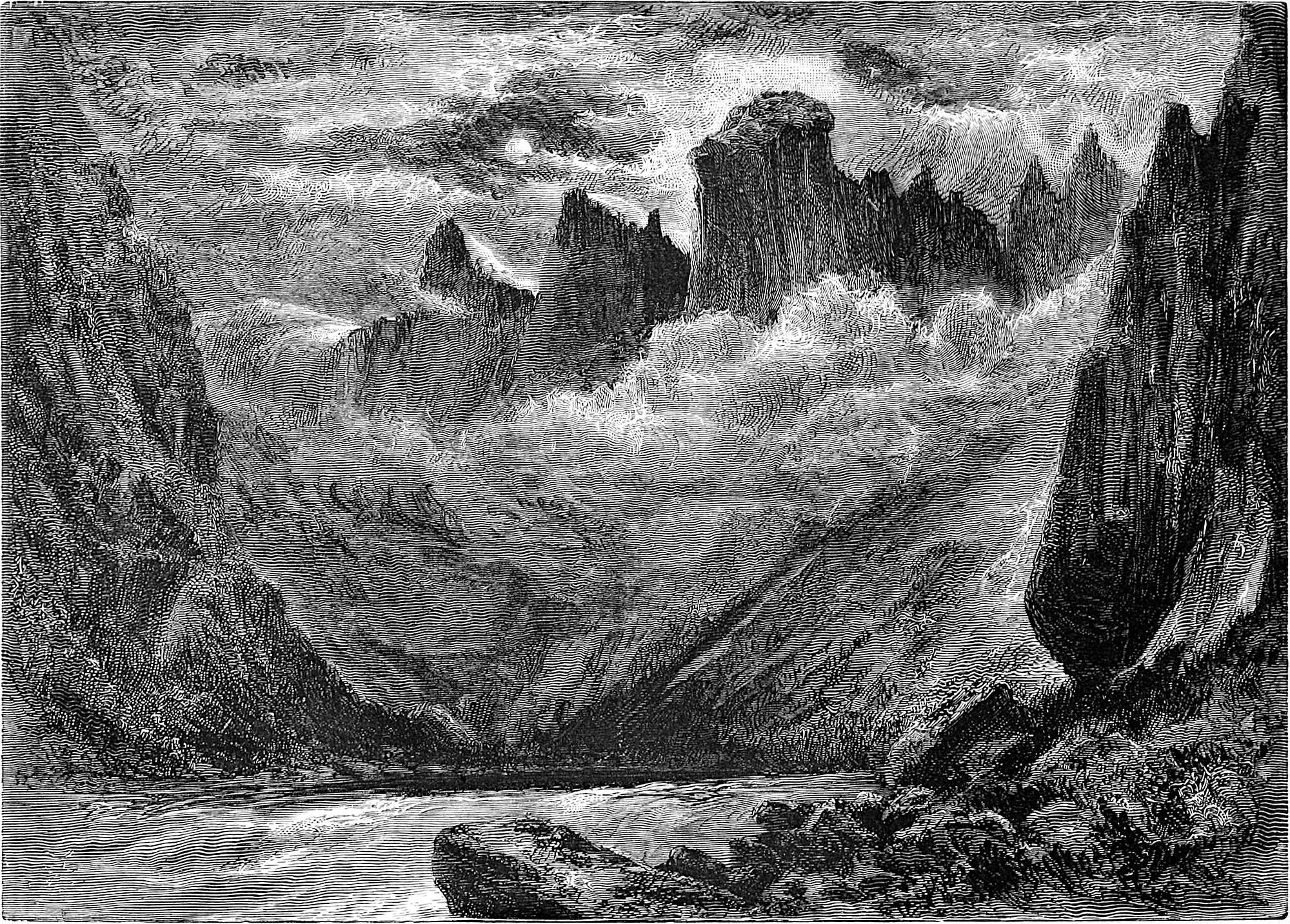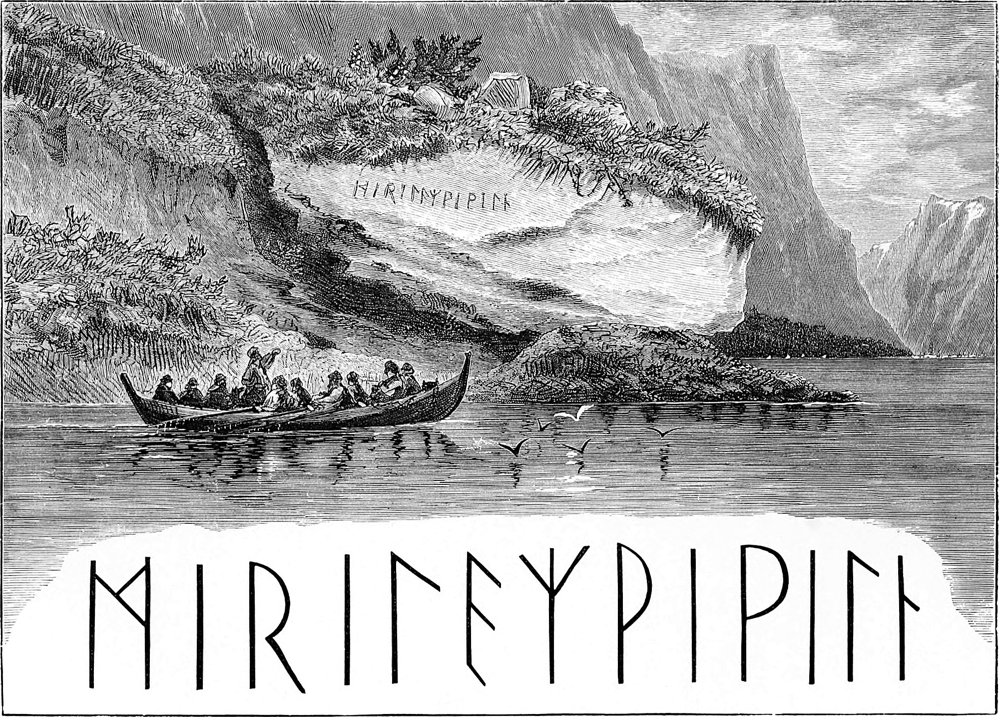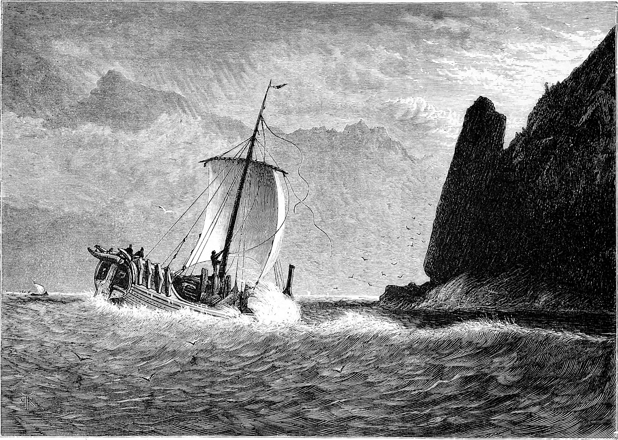 To visit Oscar’s Hall the most pleasant way is to take a boat and row across. This was suggested by Hans, and we were glad to find that he took kindly to boat work, as he came from Gudbransdalen, which is inland. More pleased, however, were we to discover, when about half-way across, that Hans was gradually bursting out into song, singing in a clear voice one of Kjerulf’s sweetest compositions, which we give in part at the end of the chapter. There is a plaintive sweetness throughout it, and the beauty of the evening, coupled with the surprise, caused us to anticipate 13many future repetitions, as nothing, when travelling, is more humanising and soothing than vocal or instrumental music.