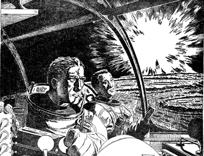 He clicked off the communicator, and we turned to the port together to watch the little metal sphere that hurtled up out of the darkness past the Luna V. From behind and above us there came a great white flash of atomic fire that must have blinded for the moment every watching eye on Earth.