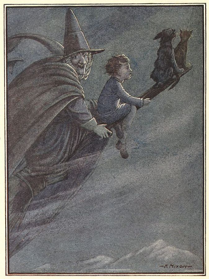 The witch's kitchen. What a witch really looks like. Her curious smile. Wonders will never cease! What happened when the kettle boiled. "Will you ride on your catoplane?" George guesses again. It is all very puzzling.