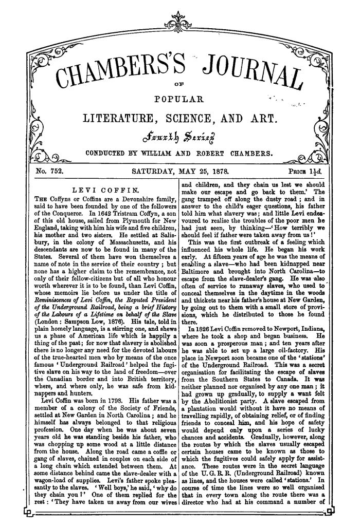 The Coffyns or Coffins are a Devonshire family, said to have been founded by one of the followers of the Conqueror. In 1642 Tristram Coffyn, a son of this old house, sailed from Plymouth for New England, taking with him his wife and five children, his mother and two sisters. He settled at Salisbury, in the colony of Massachusetts, and his descendants are now to be found in many of the States. Several of them have won themselves a name of note in the service of their country; but none has a higher claim to the remembrance, not only of their fellow-citizens but of all who honour worth wherever it is to be found, than Levi Coffin, whose memoirs lie before us under the title of Reminiscences of Levi Coffin, the Reputed President of the Underground Railroad, being a brief History of the Labours of a Lifetime on behalf of the Slave (London: Sampson Low, 1876). His tale, told in plain homely language, is a stirring one, and shews us a phase of American life which is happily a thing of the past; for now that slavery is abolished there is no longer any need for the devoted labours of the true-hearted men who by means of the once famous ‘Underground Railroad’ helped the fugitive slave on his way to the land of freedom—over the Canadian border and into British territory, where, and where only, he was safe from kidnappers and hunters.