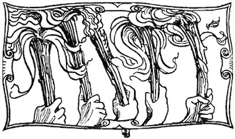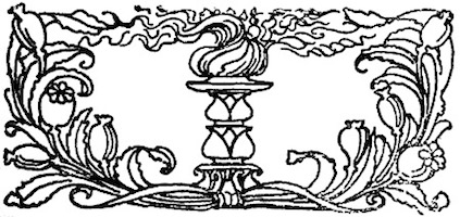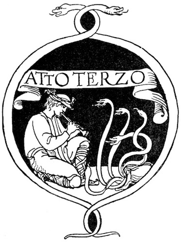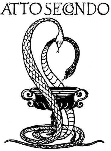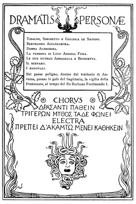 Appare un'aula vastissima nella casa antica dei Sangro costrutta sul dosso ineguale del monte. Alla robustezza della primitiva ossatura normanna tutte le età han sovrapposto le loro testimonianze di pietra e di cotto, dal regno degli Angioini al regno dei Borboni. Ricorre all'intorno un ballatoio ricco di sculture, sopra arcate profonde; delle quali alcune sono tuttora aperte, altre sono richiuse, altre sono rette da puntelli. Delle tre in prospetto, la mediana prolunga la sua vôlta verso il giardino che splende, di là da un cancello di ferro, con i suoi cipressi le sue statue i suoi vivai; la destra mette a una scala che ascende e si perde nell'ombra; la sinistra, ornata in ciascun fianco da un mausoleo, s'incurva su la porta della cappella gentilizia che a traverso i trafori di un rosone spande il chiarore delle sue lampade votive. A destra [8] gli archi, più leggeri, sorretti da pilastri isolati, si aprono su una loggetta del Rinascimento a cui fa capo un ramo della scala che discende nella corte. A sinistra, nel muramento d'un arco è praticata una piccola porta; e quivi presso, armadii e scaffali son carichi di rotoli e di filze. Cumuli di vecchie pergamene ingombrano anche il pavimento sconnesso, sopraccàricano una tavola massiccia intorno a cui son seggioloni e scranne. Busti illustri su alte mensole, grandi torcieri di ferro battuto, cassapanche scolpite, una portantina dipinta, alcuni frammenti marmorei compiscono la suppellèttile. Una fontana di gentile lavoro, dominata da una statuetta muliebre, alza nel mezzo dell'aula la sua conca vacua. E il tutto è vetusto, consunto, corroso, fenduto, coperto di polvere, condannato a perire.