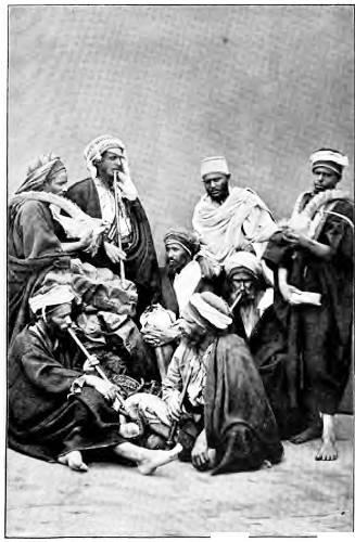 I should like to describe our house at Salahíyyeh once more, though I have described it before, and Frederick Leighton once drew a sketch of it, so that it is pretty well known. Our house faced the road and the opposite gardens, and it was flanked on one side by the Mosque and on the other by the Hammám (Turkish Bath), and there were gardens at the back. On the other side of the road were apricot trees, whose varying beauty of bud and leaf and flower and fruit can be better imagined than described. Among these apricot orchards I had a capital stable for twelve horses, and a good room attached to it for any number of saises, or grooms; and beyond that again was a little garden, through which the river wended its way. So much for the exterior. Now to come indoors. As one entered, first of all came the courtyard, boldly painted in broad stripes of red and white and blue, after the manner of all the courtyards in Damascus. Here too splashed the fountain, and all around were orange, lemon, and jessamine trees. Two steps took one to the líwán, [377]a raised room open one side to the court, and spread with carpets, divans, and Eastern stuffs. It was here, in the summer, I was wont to receive. On the right side of the court was a dining-room, and on the left a cool sitting-room, when it was too hot to live upstairs. All the rest of the space below was left to the servants and offices. Upstairs the rooms ran around two sides of the courtyard. A long terrace occupied the other two sides, joining the rooms at either end. This terrace formed a pleasant housetop in the cool evenings. We spread it with mats and divans, and used to sit among the flowers and shrubs, and look over Damascus and sniff the desert air beyond.