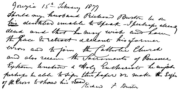 “There has lately been published a so-called ‘true’ Life of the late Sir Richard Burton, written by his niece. Since my letter to The Catholic Times, which appeared in the issue of December 24, it has been pointed out to me that it would be well if I could procure a written attestation of the priest who gave Extreme Unction to the late Sir Richard Burton. I am authorized by Monseigneur Sterk to place in the hands of your Eminence the enclosed manuscript, written by Monseigneur Martelani, who is now Prebendary of the Cathedral here. As an intimate friend of the Burtons, I beg to say that everything said about the life of the Burtons at this place in the ‘true’ life has been written from dictation, and, furthermore, that I could name the authoress’s informant, which makes the book worthless for those who know the source from which the authoress has gathered her information—the same source which has made Lady Burton’s life hideous from the day of her husband’s death to the time she left this place. As regards those who claim to have known all about Sir Richard Burton—‘They knew the man well,’ etc.—allow me to point out that the exoteric subtleties of his character were only exceeded by the esoteric; and to what an extent this is true is only known to those who were at the same time his friends and his wife’s intimate friends, of whom there are several here beside myself. My position at the Villa Gosslett was perhaps a little exceptional. Having come here from England in 1875 after my marriage, I was looked upon by the Burtons as a sort of ex-subject of theirs.