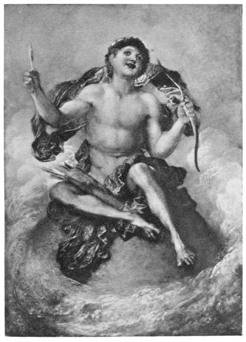 Similar lines of comparison, so far as they appear to possess any value, could, of course, be very easily pointed out in connexion with the character of{62} Watts’ draughtsmanship. That his lines are simple and powerful, that both in strength and weakness they are candid and austere, that they are not Celtic, not Catholic, and not romantic lines of draughtsmanship, would, I think, appear sufficiently clear to anyone who has any instinct for this mode of judgment at all. In the matter of line and composition, of course, the same general contention applies as in the case of colour. The curve of the bent figure of Hope, considered simply as a curve, half repeating as it does the upper curve of the globe, suggests a feeling, a sense of fear, of simplicity, of something which lies near to the nature of the idea itself, the idea which inspires the title of the picture. The splendid rushing whirlpool of curves which constitutes, as it were, the ellipse of the two figures in Diana and Endymion is a positive inspiration. It is, simply as a form for a picture, a mere scheme of lines, the very soul of Greece. It is simple; it is full and free; it follows great laws of harmony, but it follows them swiftly and at will; it is headlong, and yet at rest, like the solid arch of a waterfall. It is a rushing and passionate meeting of two superb human figures; and it is almost a mathematical harmony. Technically, at least, and as a matter of outlines, it is probably the artist’s masterpiece.