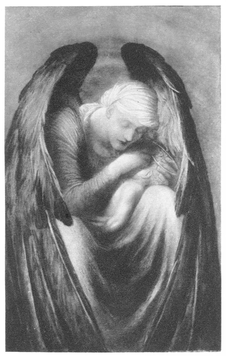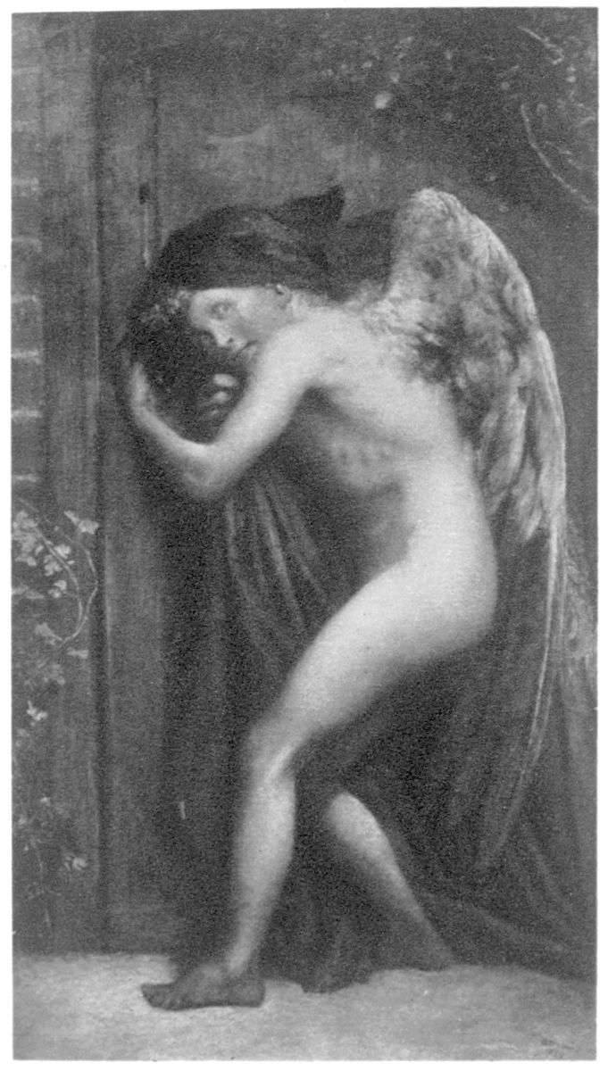 I need not instance the admirable and innumerable cases of this fine and individual effect. Eve Repentant (that fine picture), in which the agony of a gigantic womanhood is conveyed as it could not be conveyed by any power of visage, in the powerful contortion of the muscular and yet beautiful back, is the first that occurs to the mind. The sad and sardonic picture painted in later years, For He had Great Possessions—showing the young man of the Gospel loaded with his intolerable pomp of garments and his head sunken out of sight—is of course another. Others are slighter instances, like Good Luck to your Fishing. He has again carried the principle, in one instance, to an extreme seldom adopted, I should fancy, either by artist or man. He has painted a very graceful portrait of his wife, in which that lady’s face is entirely{64} omitted, the head being abruptly turned away. But it is indeed idle to multiply these instances of the painter’s hobby (if one may use the phrase) of the worship of the human back, when all such instances have been dwarfed and overshadowed by the one famous and tremendous instance that everyone knows. Love and Death is truly a great achievement: if it stood alone it would have made a man great. And it fits in with a peculiar importance with the general view I am suggesting of the Watts technique. For the whole picture really hangs, both technically and morally, upon one single line, a line that could be drawn across a blank canvas, the spine-line of the central figure of Death with its great falling garment. The whole composition, the whole conception, and, I was going to say, the whole moral of the picture, could be deduced from that single line. The moral of the picture (if moral were the right phrase for these things) is, it is scarcely necessary to point out, the monument of about as noble a silence and suppression as the human mind ever bent itself to in its pride. It is the great masterpiece of agnosticism. In that picture agnosticism—not the cheap and querulous incredulity which abuses the phrase, but loyal and consistent agnosticism, which is as willing to believe good as evil and to harbour faith as doubt—has here its great and pathetic place and symbol in the house of the arts. It is the artistic embodiment of reverent ignorance at its highest, fully as much as the Divine Comedy is the artistic embodiment of Christianity.