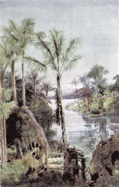 On we go, gliding past the crocodiles that lie basking in the sun, and that lazily open one eye at us or a huge mouth, the sight making us shudder, but with a sense of devout thankfulness that we are at a respectable distance! No sound disturbs the quiet, except the ripple of the water, and the screams of gaily-coloured parrots. Now and again we hear a sound like human voices, and straining our ears to listen we find to our amusement that it comes from[18] monkeys chattering and quarrelling among themselves.