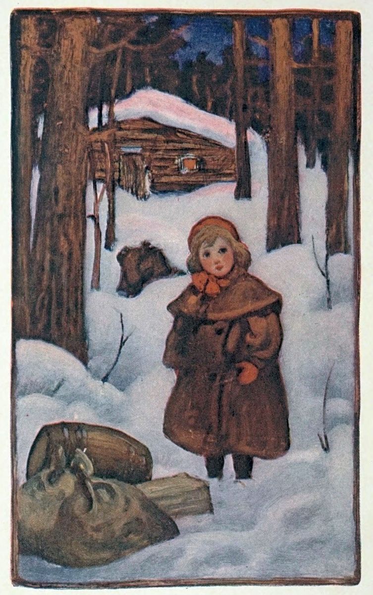 She hesitated in her turn, and cast a backward glance at the silent house whose tin roof flashed almost like an admonishing eye in the sun. Duty was a word of even less pro{23}portions in her vocabulary than in Terry’s, though she knew its existence; knew, too, young as she was, the wide gulf that lies between right and wrong doing. Yet here was no question of wrong, certainly. The possibility of the passing of such an Important Personage had never occurred to her elders, and they, who loved to see her happy, would never refuse to let her go with him; it wasn’t necessary to ask—she couldn’t wait. The house was so lonely! Her uncle was away at his work, and her mother sat sad and quiet, sewing the livelong day; there were no children’s voices in the empty rooms, no rollicking, romping feet in the hall or on the stairs. Just silence, save for the little sounds she herself made as she played with{24} her dolls, or, tired of them, watched the big, desolate world from the window. That was the picture the house held for her. This,—she looked again at the little red-cheeked, blue-eyed man smiling at her from under his big fur cap, his white beard framing his jovial face—why, he had just stepped from her story book; hundreds of times he had met her glance in this same friendly fashion from the printed page; just so had he looked at her in those long daydreams, gleamed at her so in the twilight from the leaping fire, haunted her slumbers at night. Even the sound of his voice was familiar, though she had never thought to hear him say: “Come with me, come with me.”