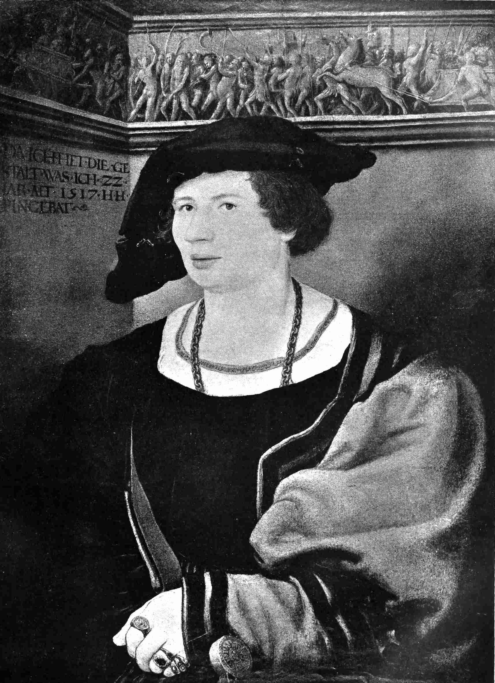 By the gracious permission of His Majesty the King, the writer has been allowed to include among the illustrations, reproductions, in some instances in colour, of a number of pictures and drawings by Holbein in the royal collections; and he has to thank the Lord Chamberlain and Mr. Lionel Cust, M.V.O., Surveyor of the King’s Pictures, for the kind assistance they rendered him in obtaining such permission. He has also to express his grateful acknowledgments to ixa number of owners and collectors for similar permission to reproduce works by the master in their possession, among them Her Majesty the Queen of Holland, who has graciously allowed the inclusion of the beautiful miniature of an Unknown Youth; the Duke of Devonshire, G.C.V.O.; Earl Spencer, G.C.V.O.; the Earl of Radnor; Lord Leconfield; the Earl of Yarborough; Sir John Ramsden, Bt.; Sir Hugh P. Lane; the late Mr. J. Pierpont Morgan; Major Charles Palmer; and the Barber-Surgeons’ Company. Special thanks are due to Lord St. Oswald for permitting the large “More Family Group” at Nostell Priory to be photographed for the purposes of this book, and for allowing the writer to take notes from a very interesting manuscript containing a description of the various versions of the Family picture compiled by his grandfather, Mr. Charles Winn. He has also to record his great indebtedness to Mr. Ayerst H. Buttery for giving him the privilege of reproducing the recently discovered portrait of an Unknown English Lady, formerly in the possession of the Bodenham family at Rotherwas, near Hereford. His thanks also are due to Senhor José de Figueiredo, director of the National Museum of Ancient Art, Lisbon, for permission to include the elder Holbein’s “Fountain of Life” among the illustrations, as well as to the directors of a number of galleries and museums, including the Public Picture Collection, Basel; the National Gallery, British Museum, and Wallace Collection; the Kaiser Friedrich Museum, Berlin; the Imperial Gallery, Vienna; the Louvre, Paris; the Royal Picture Gallery, The Hague; the Metropolitan Museum of New York; the Royal Hermitage Gallery, St. Petersburg; and the Galleries of Dresden, Munich, Hanover, Rome, Florence, Solothurn, and elsewhere.