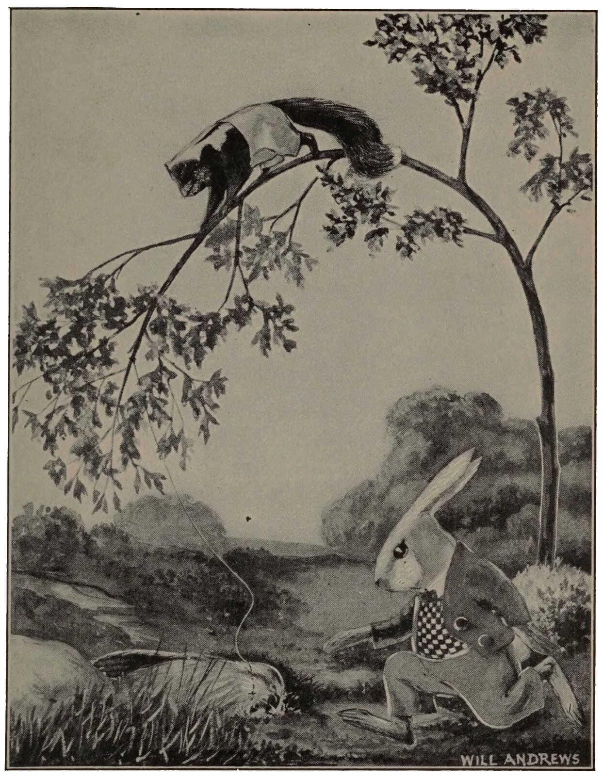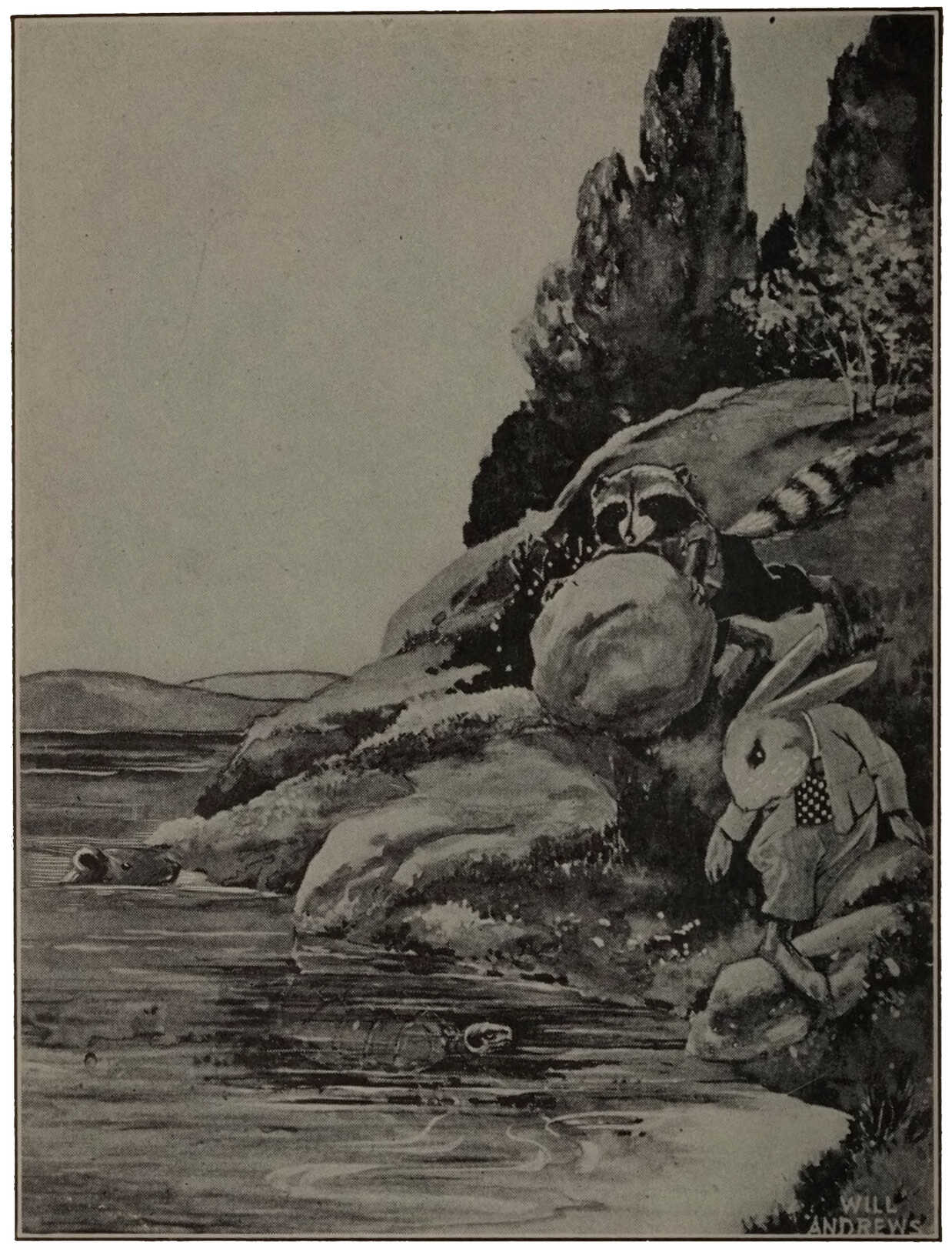 Swish, swish, swish, went Tad Coon’s bushy tail. He cocked his head. Swish—out went his hand—splash, went a great big wave all over Nibble Rabbit.